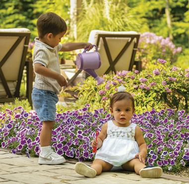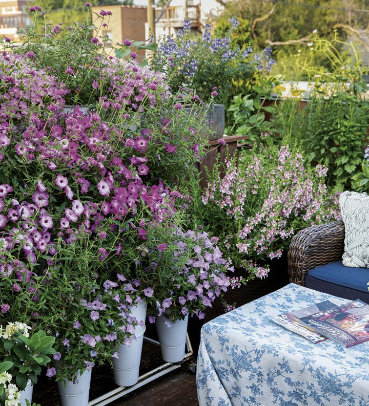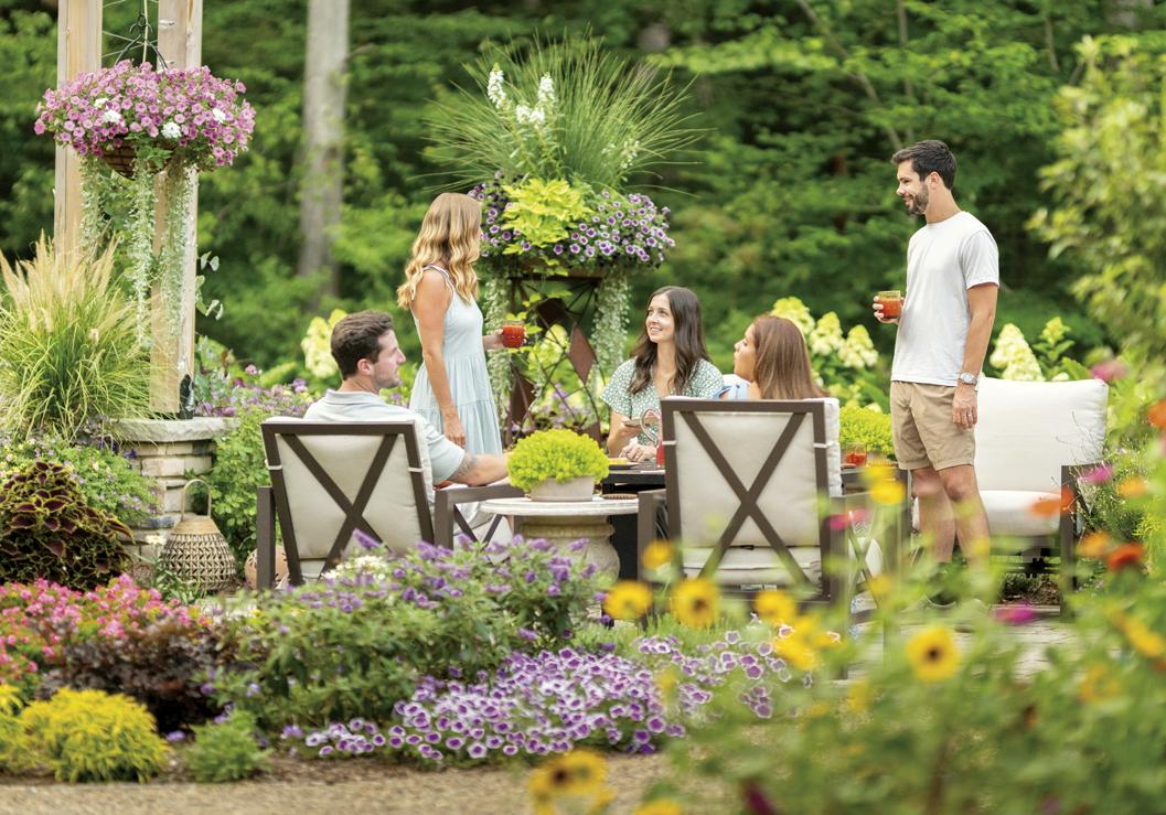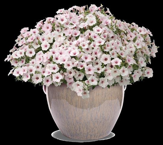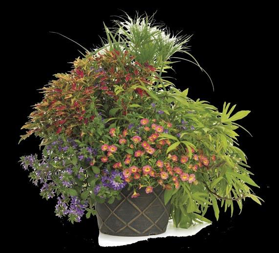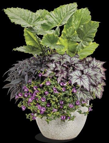 Opposite, above and pages 2-3: Annuals – EMERALD ISLE™ Alocasia (elephant ears) ANGELFACE® White Angelonia, DOUBLE UP™ Pink Begonia, SUPERBELLS MAGIC® Double Grapefruit Calibrachoa, SEÑORITA ROSALITA® Cleome, COLORBLAZE® MINI ME™ Chartreuse Coleus, COLORBLAZE® WICKED WITCH™ Coleus, SILVER FALLS® Dichondra, DIAMOND FROST® Euphorbia, DIAMOND MOUNTAIN® Euphorbia, ‘Sweet Caroline Light Green’ Ipomoea, Sweet Caroline Sweetheart SHADOWSTORM™ Ipomoea, Sweet Caroline UPSIDE™ Black Coffee Ipomoea (sweet potato vine), SAFARI® DUSK™ Jamesbrittenia, GRACEFUL GRASSES® BLUE MOHAWK® Juncus, Goldilocks Lysimachia, STRATOSPHERE™ White Oenothera, GRACEFUL GRASSES® ‘Sky Rocket’ Pennisetum, SUPERTUNIA® HOOPLA® VIVID ORCHID™ Petunia, SUPERTUNIA MINI VISTA® Midnight Petunia, SUPERTUNIA® PICASSO IN PURPLE® Petunia, SUPERTUNIA® ROYAL VELVET® Petunia, SUPERTUNIA VISTA® BUBBLEGUM® II Petunia, SUPERTUNIA VISTA® COOL JAZZ™ Petunia, LEMON CORAL® Sedum, SNOWSTORM® GIANT SNOWFLAKE® Sutera (bacopa), SUMMER WAVE® Trailing Large Violet Torenia, SUPERBENA® COBALT™ Verbena and SUPERBENA® WHITEOUT™ Verbena
