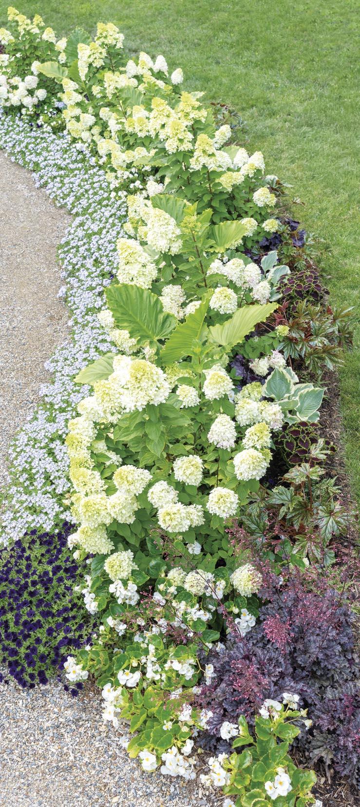 So, you’ve decided to take the plunge and plant a new hedge. The challenge: even if you start with large shrubs, you’re bound to be left with some open ground for a season or two, as was the case with this east-west oriented Limelight Prime® hydrangea hedge. Annuals are ideal for filling space while you wait for the hedge to mature. Here, we planted sun-loving annuals on the south-facing side and shade lovers on the north. Emerald Isle™ elephant ears act as living umbrellas to temporarily shade the Shadowland® ‘Hope Springs Eternal’ hostas until the hydrangeas are tall enough to do the job.