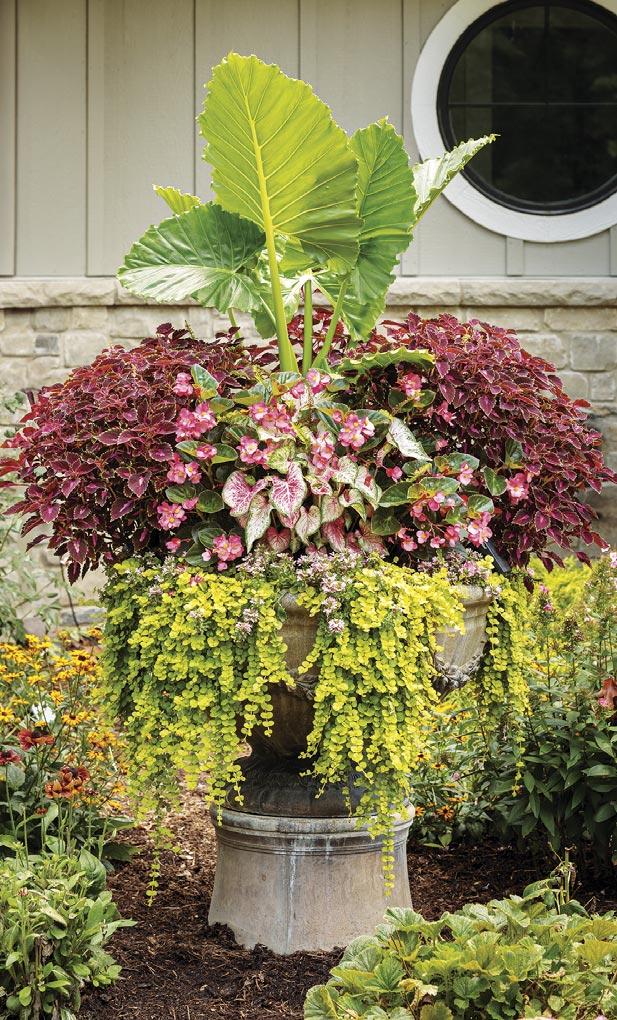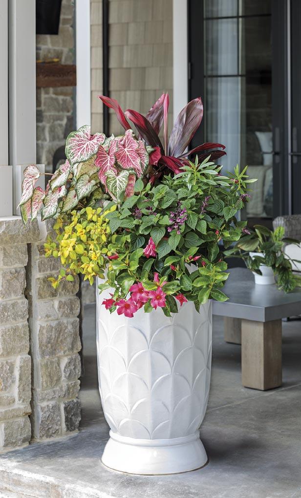 Above, 1: MEZOO™ Trailing Red Aptenia, COLORBLAZE® Chocolate Drop Coleus, ISLAND GIANTS™ ‘Coffee Cups’ Colocasia, DIAMOND SNOW® Euphorbia, LUSCIOUS® GOLDENGATE™ Lantana and SUNSTAR® Red Pentas 2: EMERALD ISLE™ Alocasia (elephant ears), SUREFIRE® Rose Begonia, HEART TO HEART® ‘Bold ‘N Beautiful’ Caladium, COLORBLAZE® VELVETEEN® Coleus, Goldilocks Lysimachia, and WHIRLWIND® Pink Scaevola 3: HEART TO HEART® ‘Bold ‘N Beautiful’ Caladium, Pink Zip Cordyline (cabbage palm), WAIKIKI SUNSET™ Lysimachia, BOMBSHELL® Coral Pink Mandevilla and UNPLUGGED® Pink Salvia 4: MEZOO™ Trailing Red Aptenia, TOUCAN® Yellow Canna, TRUFFULA® Pink Gomphrena (globe amaranth), LUSCIOUS® Royale Cosmo Lantana, Big Leaf Muehlenbeckia (creeping wire vine), MOJAVE® Mango Portulaca and WHIRLWIND® Pink Scaevola