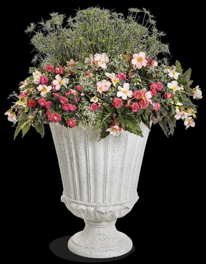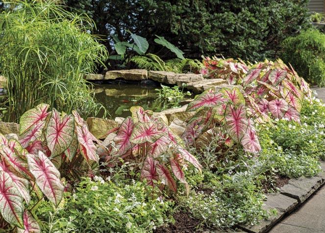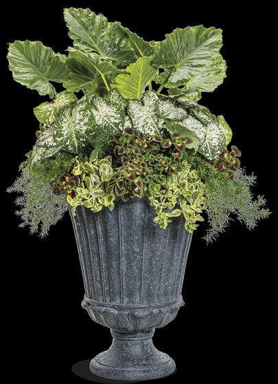 8: SILVER BULLET® Artemisia, HEART TO HEART® ‘Radiance’ Caladium, ISLAND GIANTS™ HEART OF THE JUNGLE® Colocasia (elephant ears), GRACEFUL GRASSES® BABY TUT® Cyperus, SILVER FALLS™ Dichondra and CATALINA® White Linen Torenia
