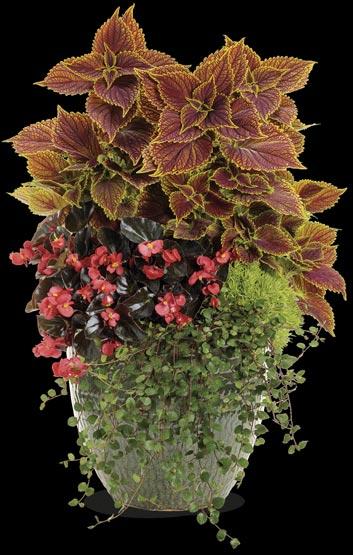 5: NORTH POLE® Thuja (arborvitae), PEGASUS® Begonia, COLORBLAZE® GOLDEN DREAMS™ Coleus, HIPPO® Rose Hypoestes, HIPPO® White Hypoestes (polka dot plant), Sweet Caroline RAVEN™ Ipomoea (sweet potato vine), Goldilocks Lysimachia and CATALINA® GILDED GRAPE™ Torenia