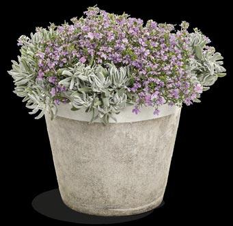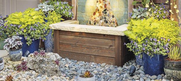 Above and in containers at left: ARTIST® Blue Ageratum, MEZOO™ Trailing Red Aptenia, GRACEFUL GRASSES® QUEEN TUT™ Cyperus, SILVER RIVER™ Didelta, Petite Licorice Helichrysum, BETH’S BLUE® Isotoma, LAGUNA® Royale Lilac Lobelia, LAGUNA® Royale Pink Lobelia, Big Leaf Creeping Wire Vine Muehlenbeckia, SOUTHERN BLAZE™ Bright Pink Phlox and LEMON CORAL® Sedum