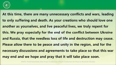 At this time, there are many unnecessary conflicts and wars, leading to only suffering and death. As your creations who should love one another as yourselves, and live peaceful lives, we truly repent for this. We pray especially for the end of the conflict between Ukraine and Russia, that the needless loss of
