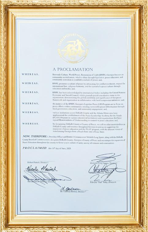 On June 10, 2025, the DeKalb County Board of Commissioners in Georgia, USA, officially designated DeKalb County as a “County of Peace” in support of HWPL Georgia’s peace initiatives. Furthermore, the county encouraged the expansion of peace education throughout all communities to foster a new culture of unity among citizens and neighborhoods. The resolution was unanimously adopted by all members of the DeKalb County Board of Commissioners present at the meeting.