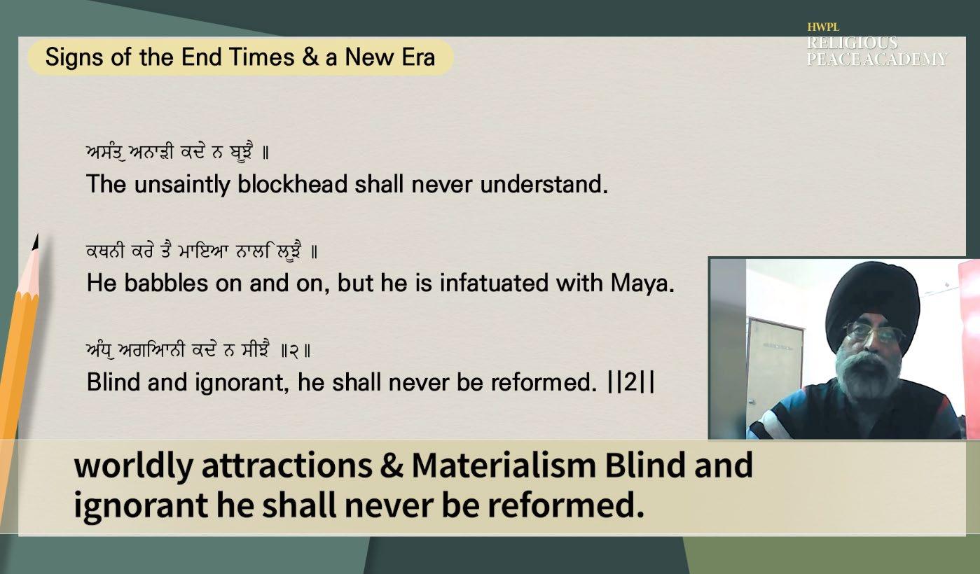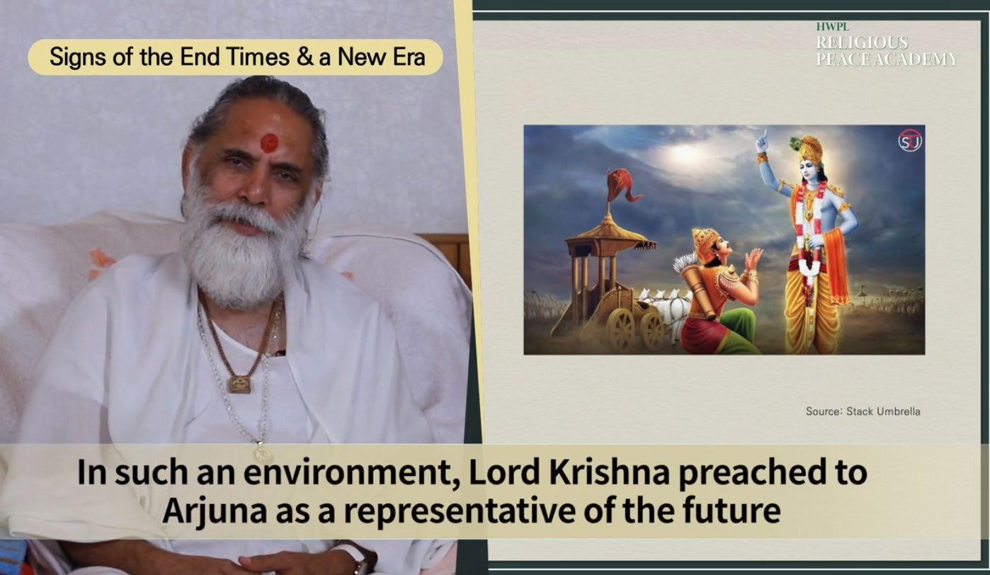 마지막 때를 위해 힌두 경전에서 마하바라타 전쟁을 언급했는데, 이는 코로 나19와 같은 문제로 인한 전쟁 구름과 세계 지배로 가득 찬 현 시대를 상징하 며 불안, 불안정, 혼란, 의심의 시간으로 이어집니다. 다가오는 세계는 평화와 조화의 신성한 세계가 될 것이며 이를 달성하기 위해서는 힌두교 경전인 바가