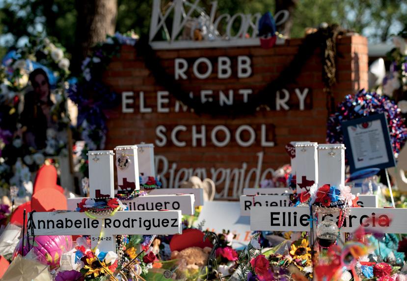 ▲ The memorial at Robb Elementary School in Uvalde, Texas following the 2022 mass shooting, whose victims where cared for by Dr. Gilberto Arbelaez ’06, Sc.D. ’23.victims. Taking a moment to pause and reflect “was helpful for everyone,”