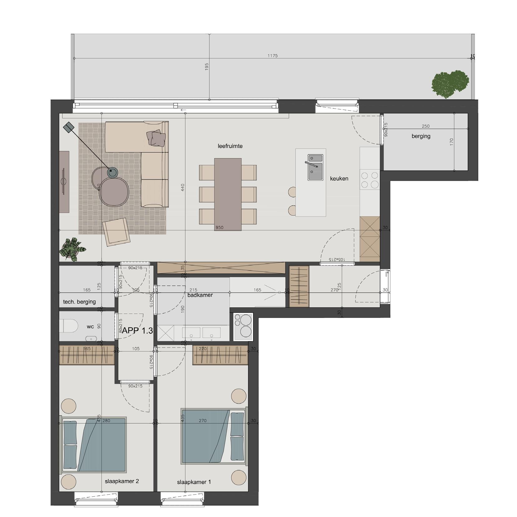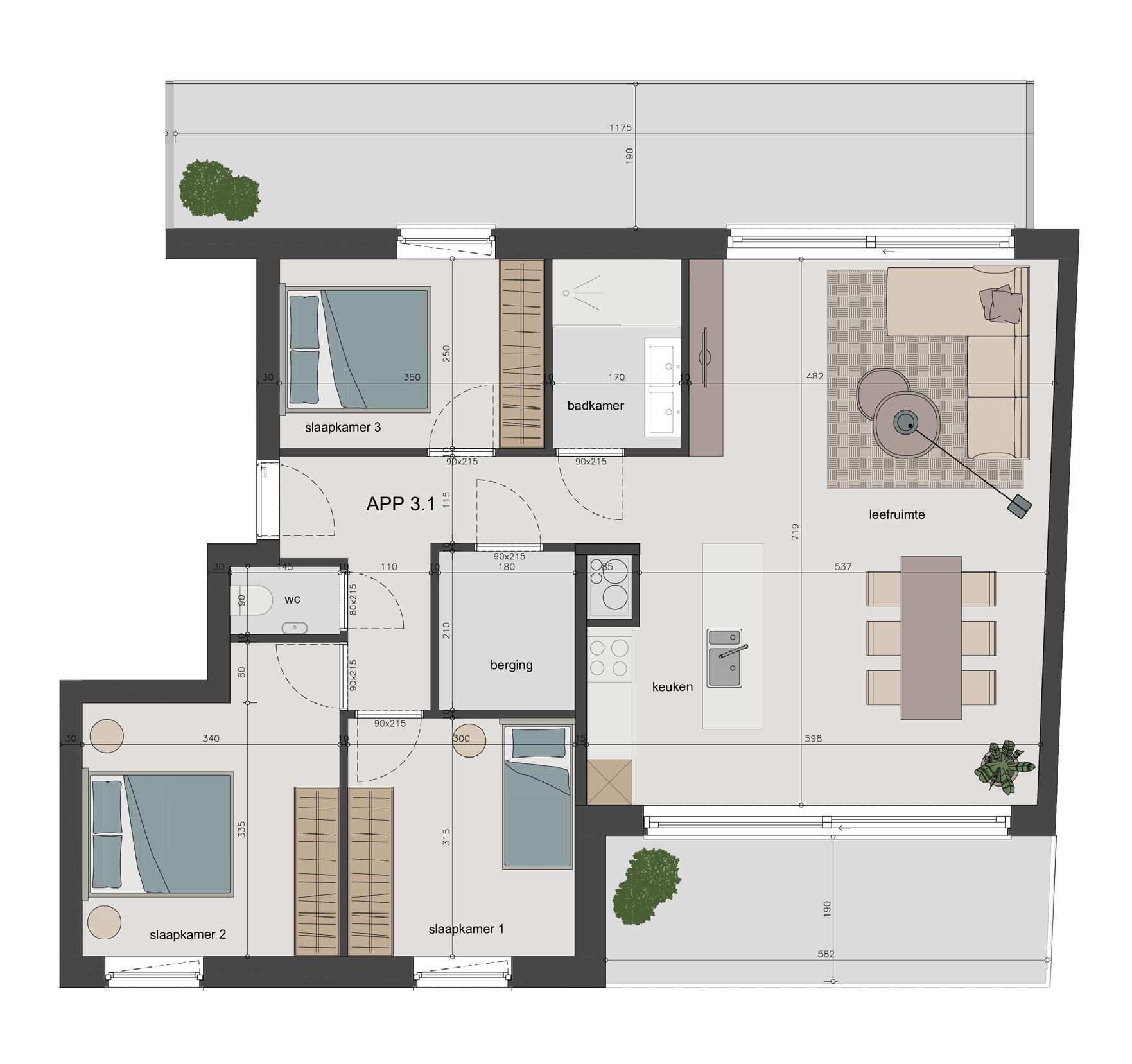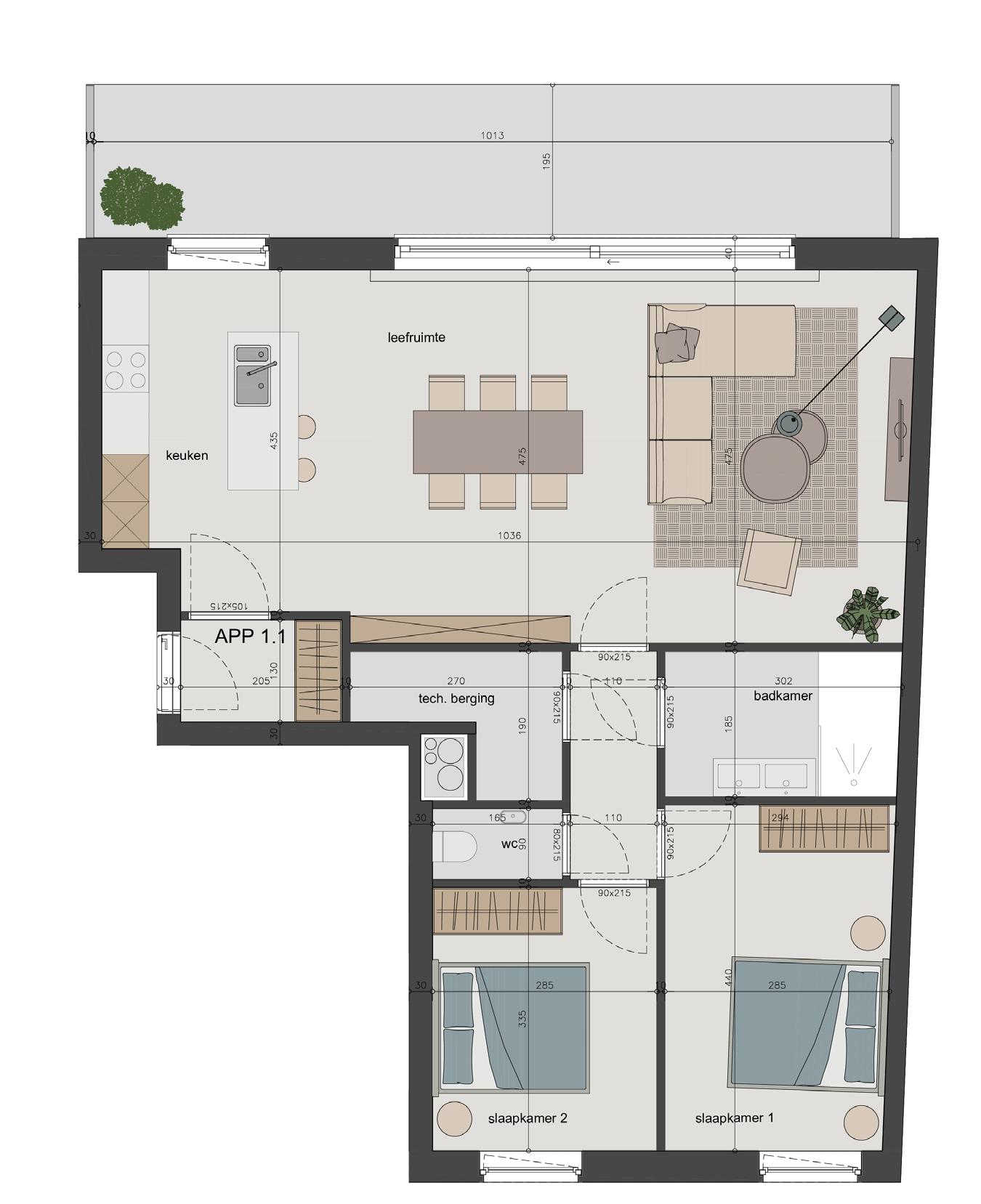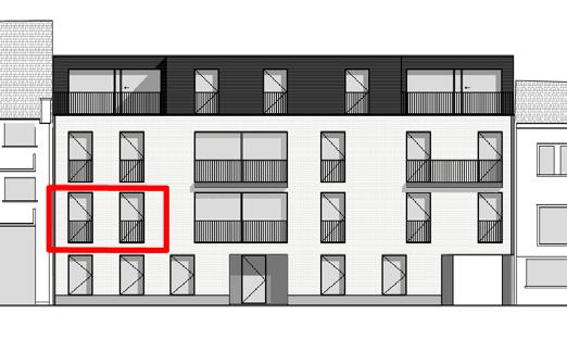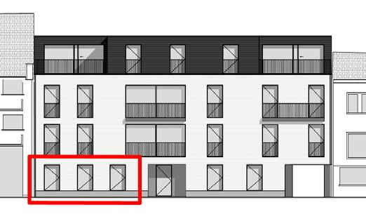 • Het terras van de gelijkvloerse appartementen wordt afgewerkt met een laag gestabiliseerde dolomietverharding en het overige gedeelte van de tuin wordt voorzien van een propere laag teelaarde met omheining