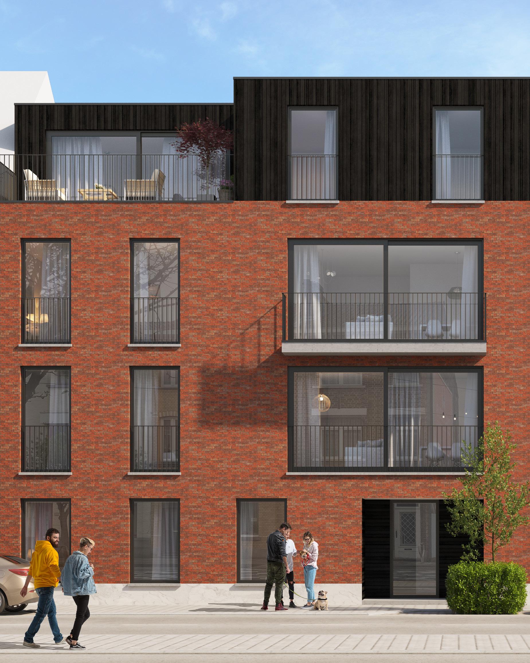 De gebruikte materialen, zoals de klassevolle rode baksteengevel met donkere houten accenten, het aluminium schrijnwerk en de strakke balustrades geven het geheel een moderne en tijdloze uitstraling. Er werd ook aandacht besteed aan de energiezuinigheid. Zo maken we gebruik van regenwaterrecuperatie voor de toiletten en gemeenschappelijke kraantjes en beschikken de appartementen over zonnepanelen.