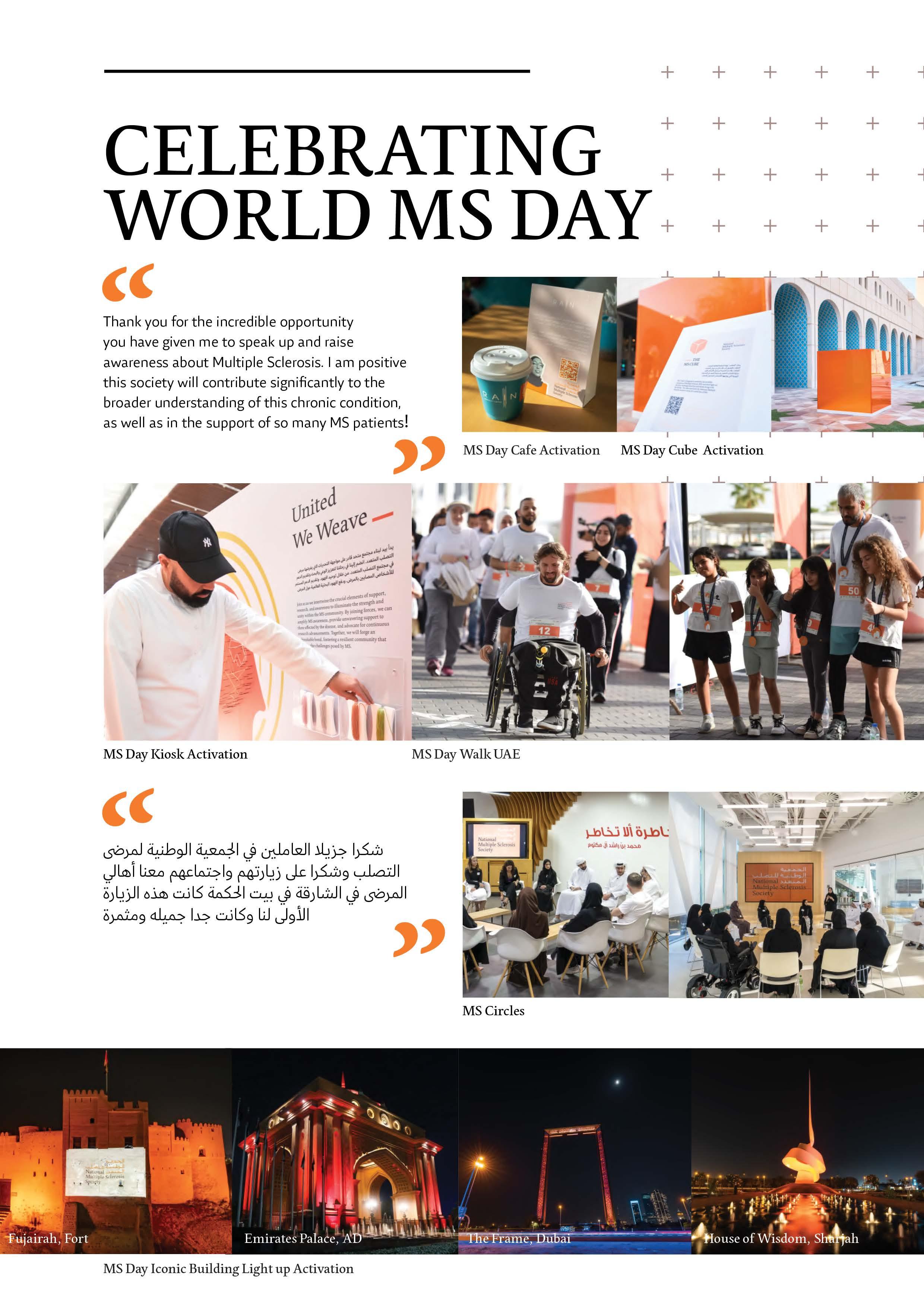 World MS Day is a day of global celebrations with the aim of sharing stories, raising awareness and campaigning with everyone a ected by MS. By extending the celebration of World MS Day throughout the entire month and introducing new initiatives and programs, the society aims to increase public awareness, promote physical and mental well-being, and provide a platform for individuals to come together and support one another..