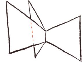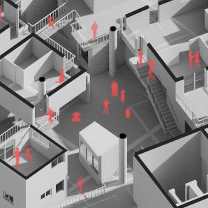 A reverse staircase is inserted into the path, creating a spatial illusion. People on opposite sides of the handrail are always at different heights, so they will never cross paths.