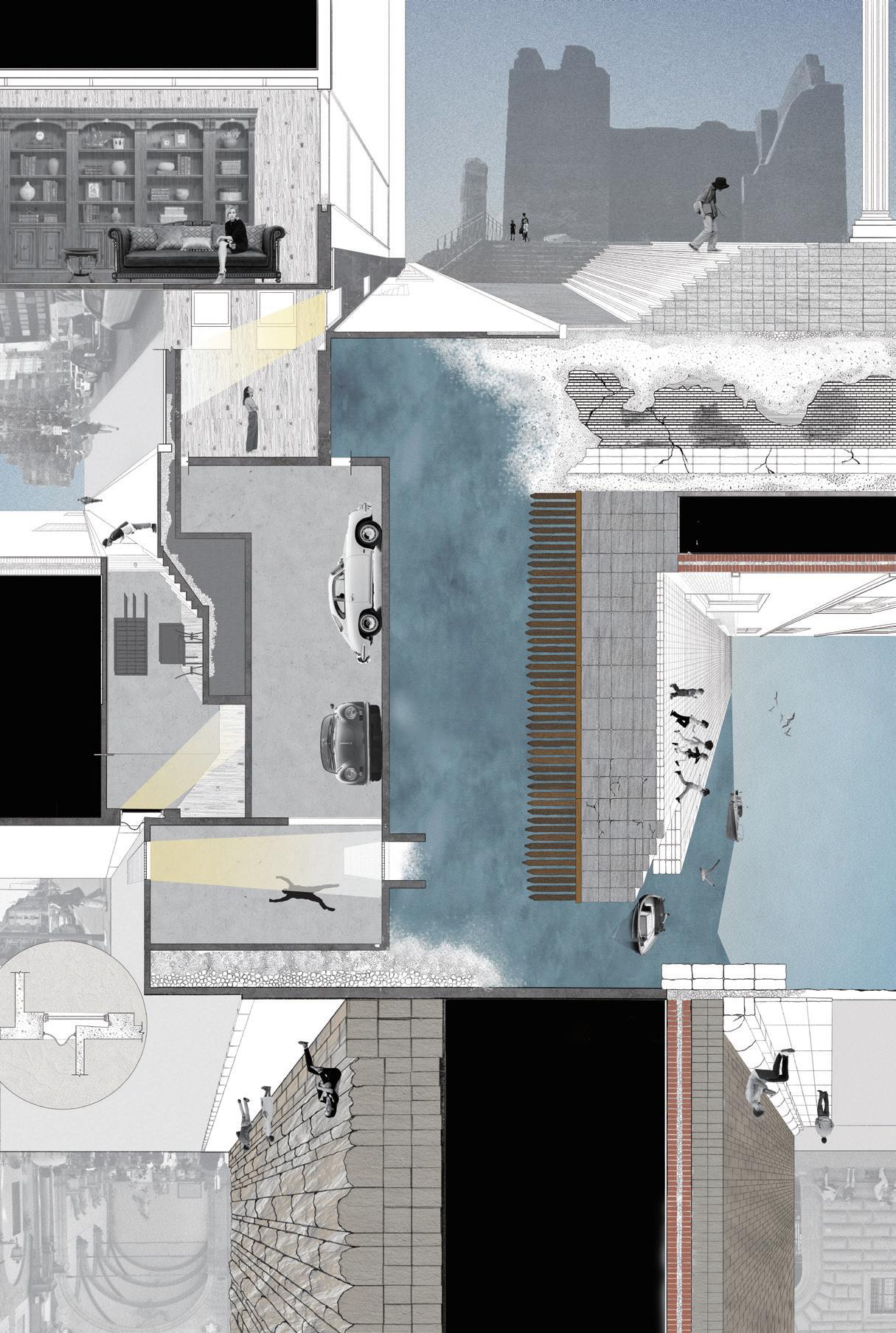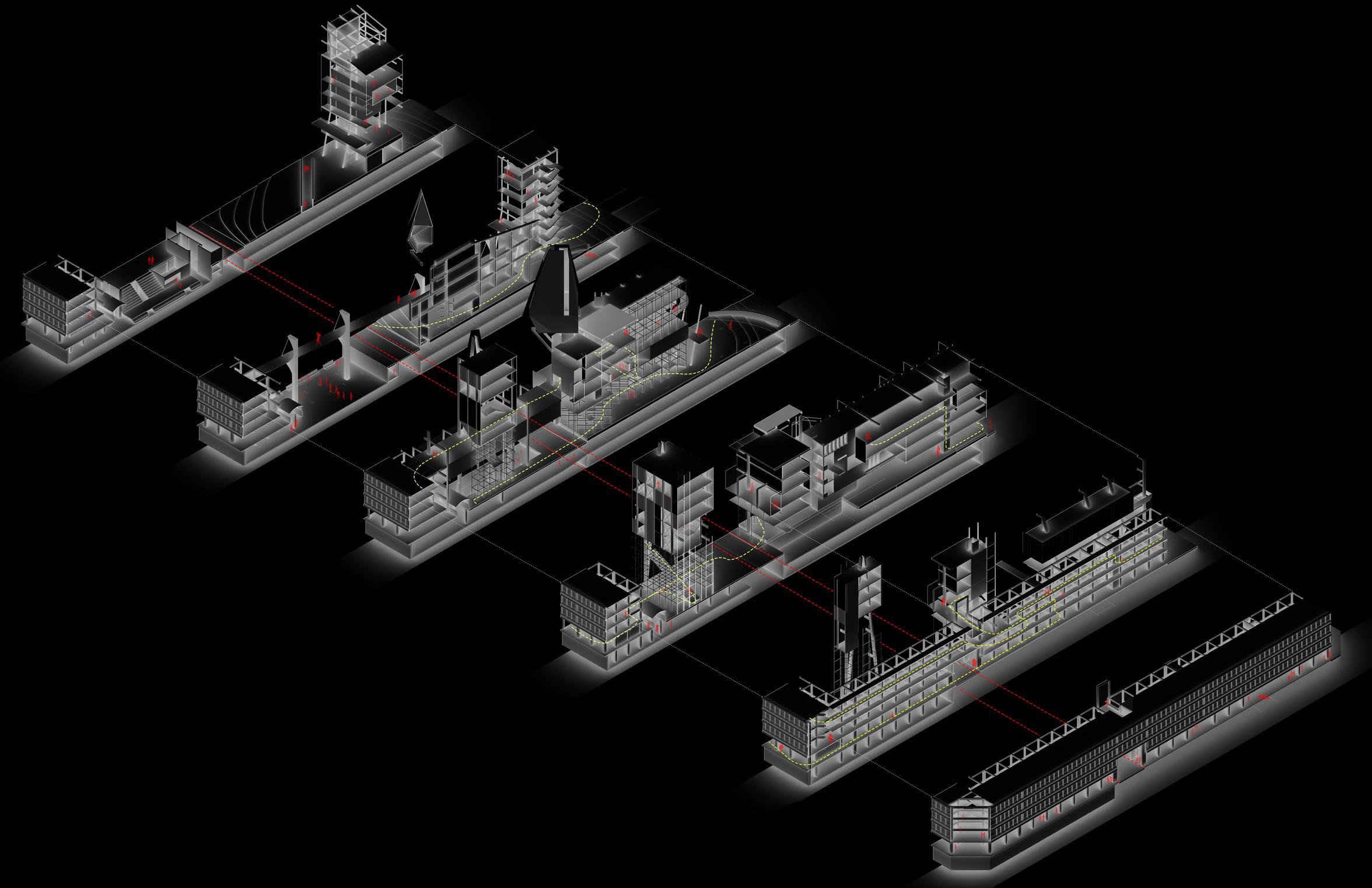 Revitalized former railway dormitories by introducing commercial functions while preserving historical remnants. My core contributions involved architectural drafting and the conceptual development of analytical diagrams to articulate the project's spatial logic.