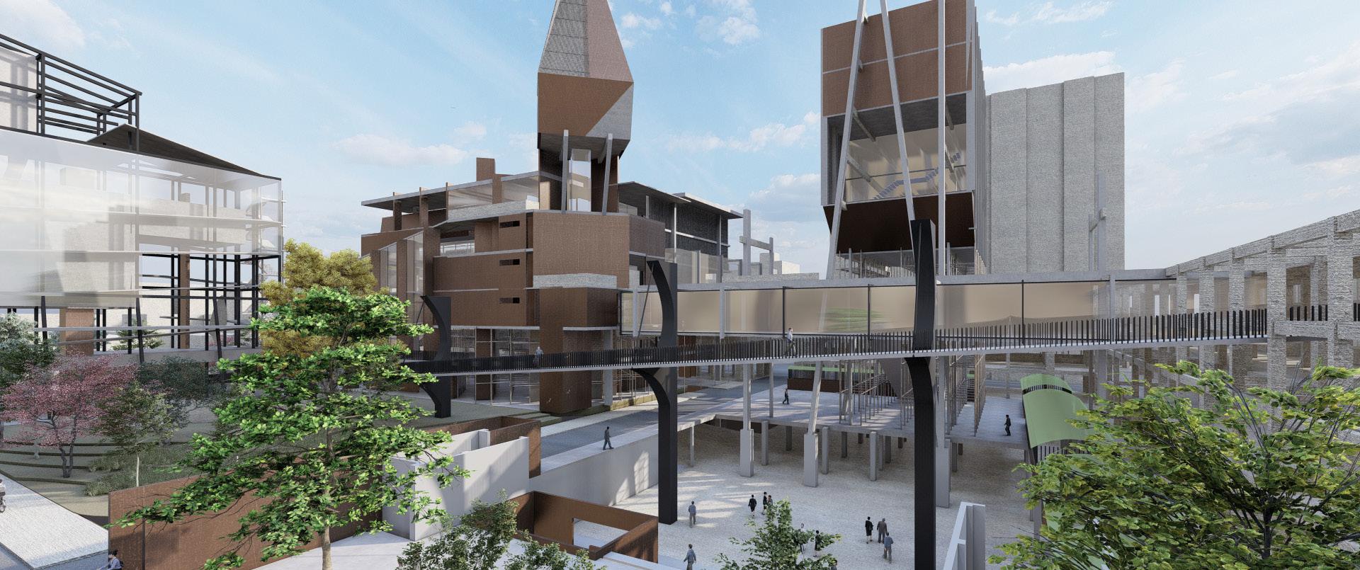 The use of triangles highlights the sharpness of metal while also forming a strong structure. Following the surrounding urban layout, the design develops from the northwest to the southeast, with metal workshops on the bridge, offering residents more opportunities to work with metal.
