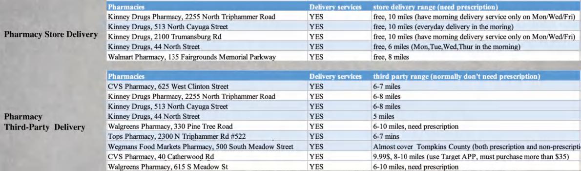 Each pharmacy and grocery store in Tompkins County: whether delivery
