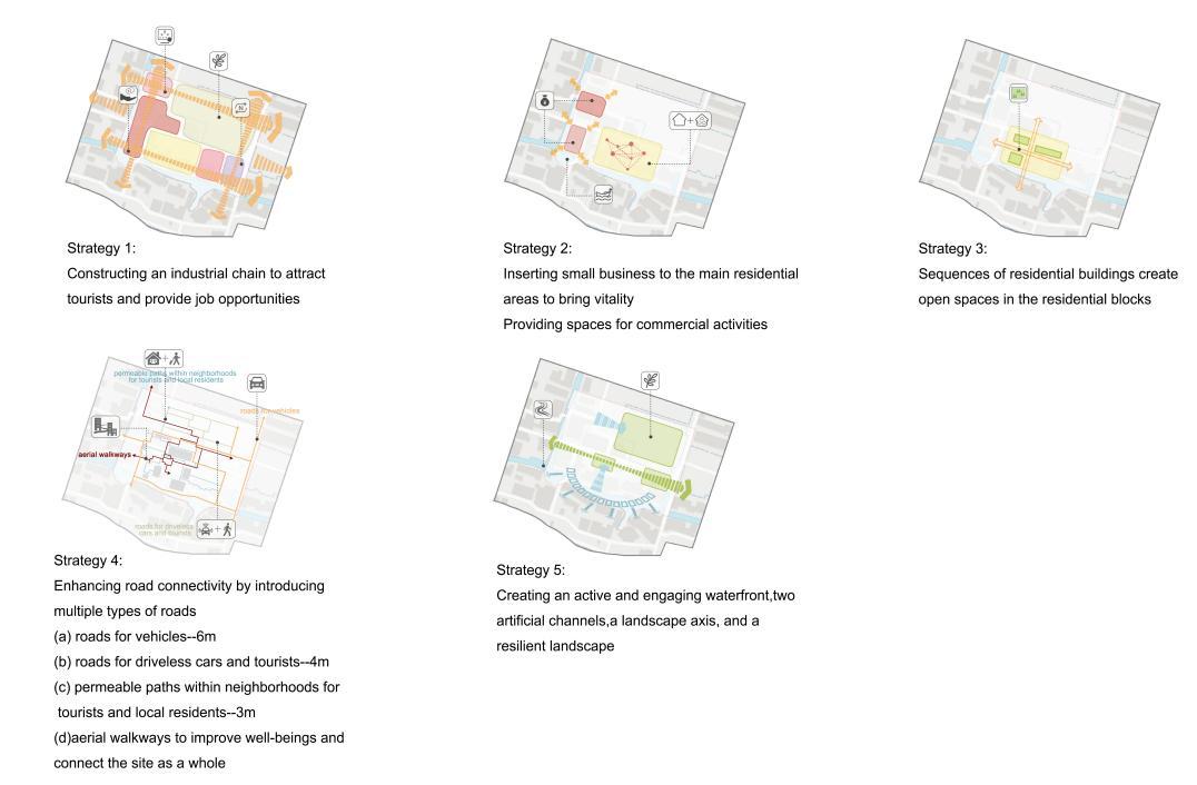 The design strategies follow a people-oriented approach by integrating dynamic industries, promoting mixed land use, fostering open communities, improving roads, and optimizing eco-space.
