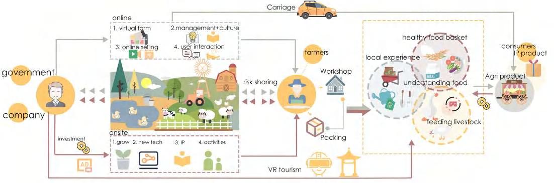 I developed a metaversebased concept integrating virtual and real-world experiences to stimulate rural tourism and local economies. The diagram illustrates a rural development model that integrates online platforms with on-site experiences. The system supports rural identity, boosts local economies, and strengthens urban-rural synergies.