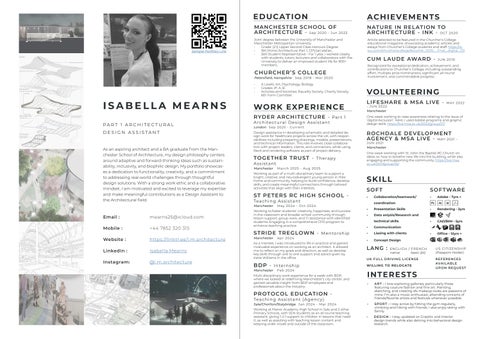 As a still recent graduate of the Manchester School of Architecture, I am currently developing my skills, personal style and design further, post degree as a Design Assistant at Ryder Architecture in London. My design philosophy centers around adaptive architectural concepts and forward-thinking ideas such as sustainability, inclusivity, and biophilic design, which are integral in any architectural career today. With a portfolio aimed at helping and educating people, I have consistently prioritized functionality and creativity throughout my academic journey. As a recent graduate, I am committed to continuing this ethos, striving to make a significant impact on the field. Each project serves as a testament to my dedication to thoughtful design solutions that address real world challenges while inspiring those around me to do the same. After completing my degree, I transitioned into SEN Teaching and Therapy Assistance roles across both primary and secondary schools, as well as in residential and home environments. This decision stemmed from a desire to deepen my understanding of educational spaces and enrich my architectural perspective in this area. Through this experience, I gained invaluable insights into the needs of neurodivergent and disabled individuals within both educational and care settings. This experience fueled my passion to specialize in creating inclusive spaces, building upon my prior exploration of this area in my third year final project. I am looking forward to leveraging my expertise to make meaningful contributions in this field. With a strong work ethic and a high level of motivation, I thrive on collaborating with others to bring creative ideas to life. I am dedicated to executing tasks promptly and responsibly, and possess a willingness to learn and grow in my field. I am confident that my ambition and determination makes me a valuable asset to any organization.