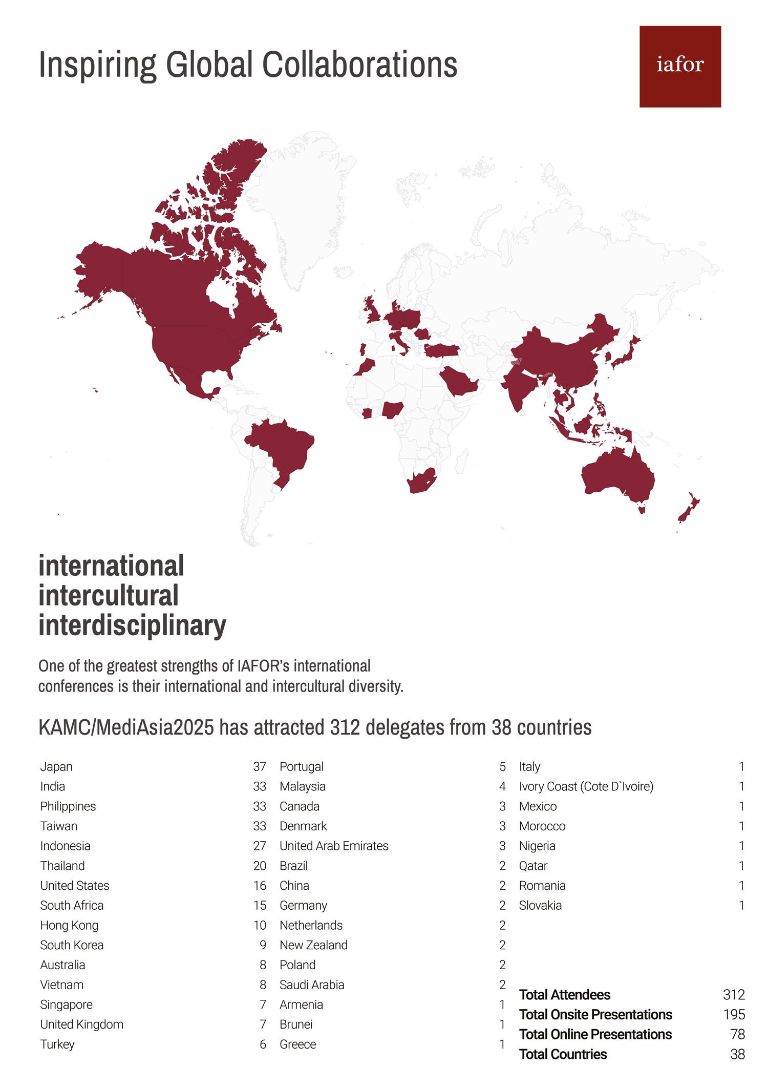 These conclusions drawn from the KAMC/MediAsia2025 conference are closely connected to the discussions currently underway at IAFOR’s education-themed conferences, where a lot is being said about the role of education, and of the university in particular, in an AI-driven and uncertain era of geopolitical tension, societal uprising, and a rising cost of living. Dr Kubo’s positive message that academic intervention can have a tangible impact on public discourse and the visibility of marginalised identities, as well as the repeated emphasis on media literacy and AI ethics, prompt us to look closer at how we prepare students and societies for the future. One of the best ways in which this can be achieved is through education. IAFOR will continue to address these issues in our upcoming conferences.