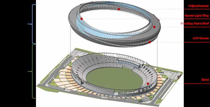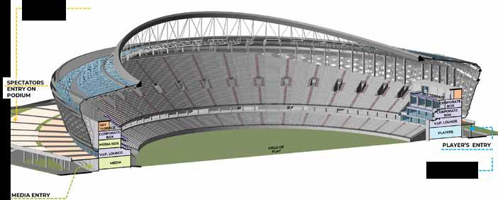 The stadium complex has been carefully planned integrating sports, recreation and commercial activities to create a financially viable and self-sustaining precinct with amenities including retail stores, restaurants, members club, banquet halls, cricket practice pitches, swimming pool, jogging track, public parks and spectator plazas to boost community engagement and making this facility a year-round sports and entertainment hub.