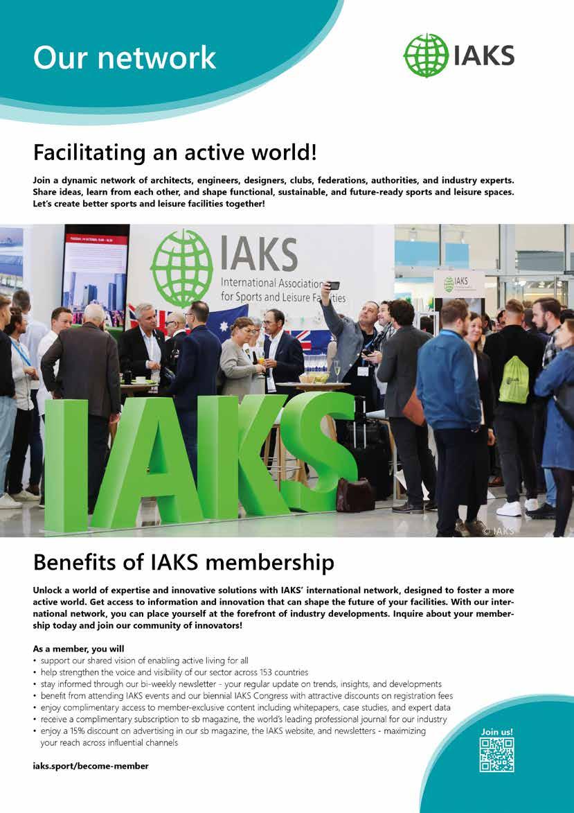 The approach that all these projects have in common is sports facilities are no longer designed exclusively for athletes. Instead, they are aimed at entire communities – serving as open spaces for exercise, socialising and relaxation. Material technologies, sustainable construction methods and intelligently designed surfaces are essential for this. They affect not only performance and safety, but also the long-term usability and environmental footprint of such facilities – and thus the quality of urban spaces for exercise over many years. The design of such spaces is therefore always also a task for society, calling for interdisciplinary collaboration between urban planners, landscape architects, sports scientists and future users. The projects featured in this issue show impressively just how varied the treatment of these issues can be – and just how much potential lies in the interlinking of sport, the urban environment and the community. This is where the IAKS comes in: bringing together international experience, sharing expertise and providing impetus for the ongoing development of our sports and recreational facilities.