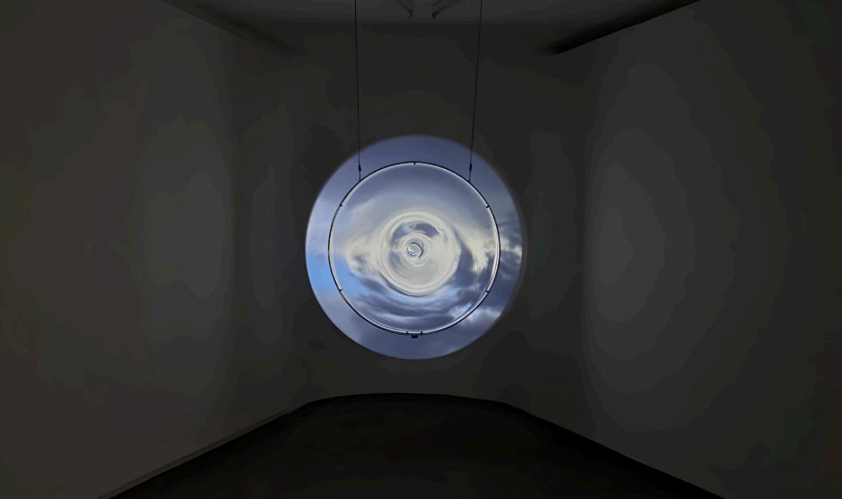 New grantee Anna May Kirk's work: Year without a Sun (2023), volcanic sand from Mount Tambora, glass, mild steel frame, video, projector, circular projection screen, 14min. Image: courtesy of the artist and Jessica Maurer