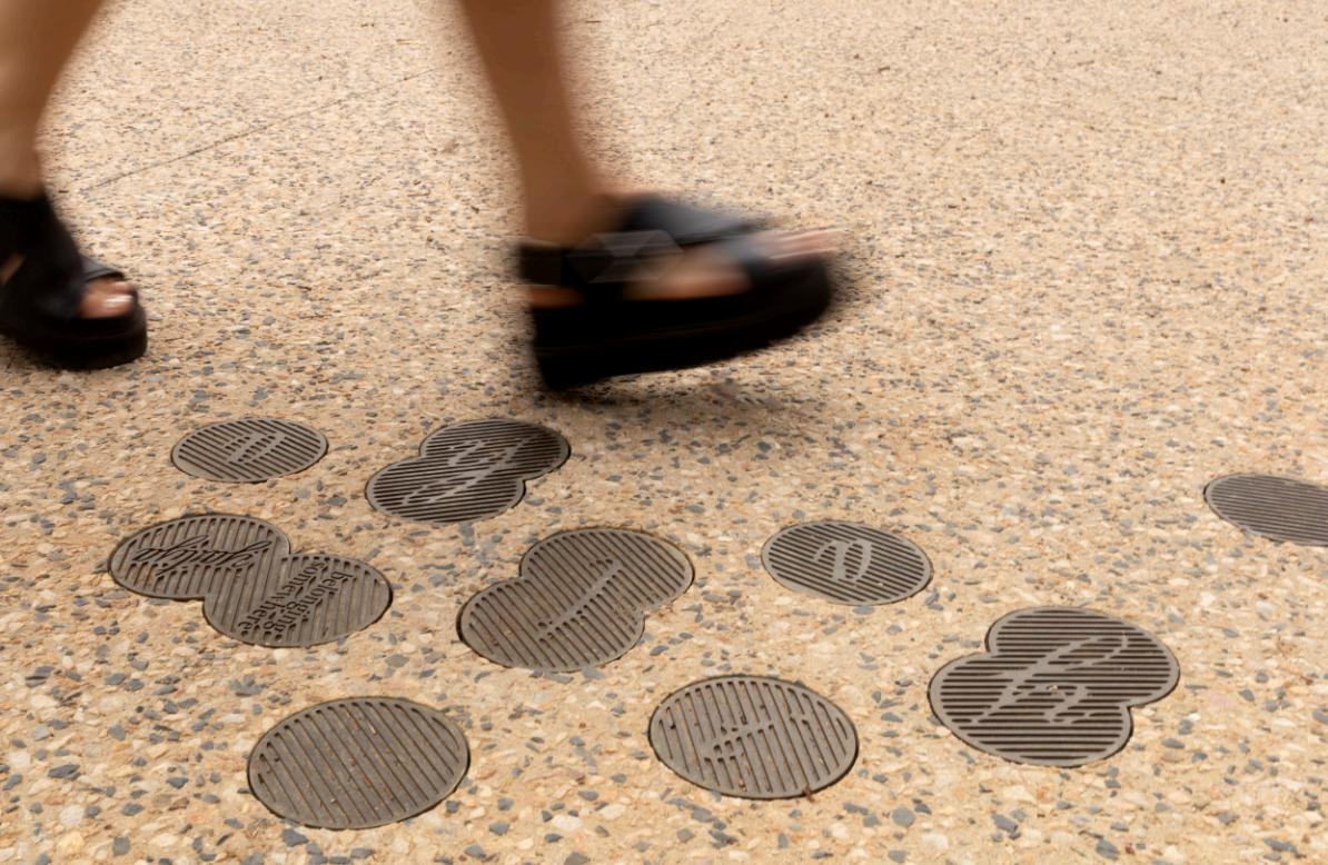 New grantee Amber Cronin's work: Walking the Language of Landscape (2024), brass, steel, archival text, public artwork on Hutt Road, Adelaide, South Australia Image: courtesy of the artist and Tom Borgas
