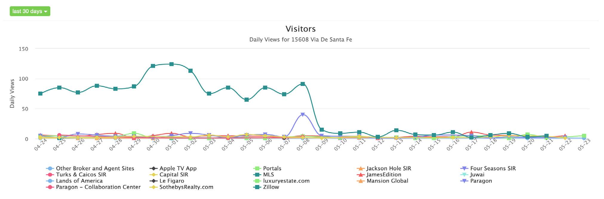 The ‘Visitors’ chart depicts any upswings or downswings for viewing activity related to your listing. Seasonal impacts, a price change, or other market factors may result in an increased or decreased number of potential buyers viewing your listing online.