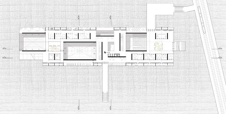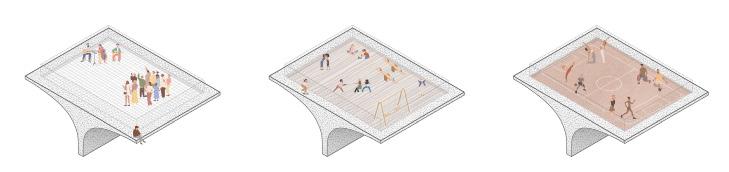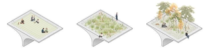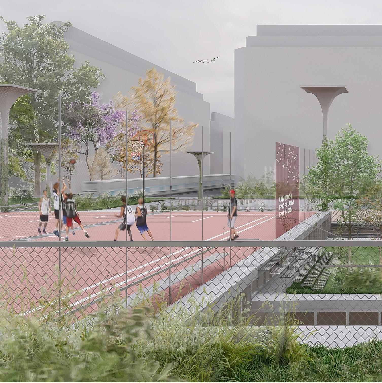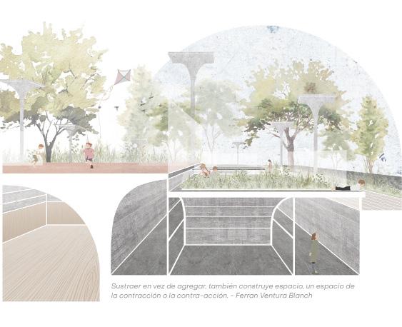 Para ello se proyecta el edificio fragmentando el nivel de la vereda, dando lugar a un nivel -1 donde convergen los programas del edificio, que alberga en sus techos un un parque que permite el recorrido público en toda su extensión.