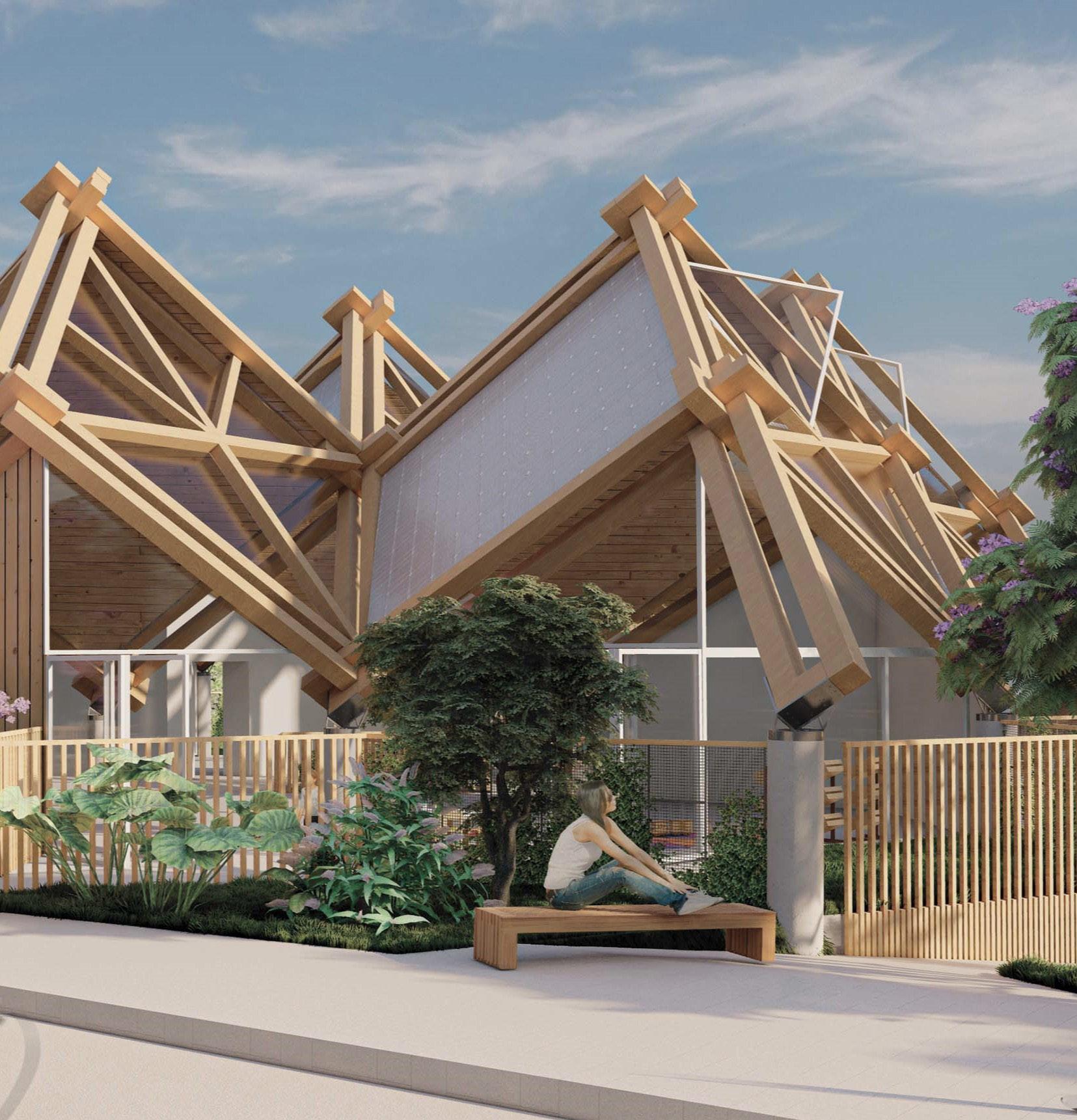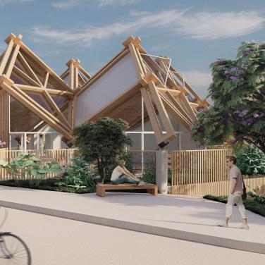 El aspecto a destacar de este proyecto es sin dudas su morfología, que surge de un ejercicio casi lúdico, partiendo módulo de madera conformado por tres piezas que unidas generan volúmenes piramidales. Cuando estos volúmenes comienzan a tejerse en en sentido vertical y horizontal, es que pueden colonizar superficie y generar recintos cerrados.
