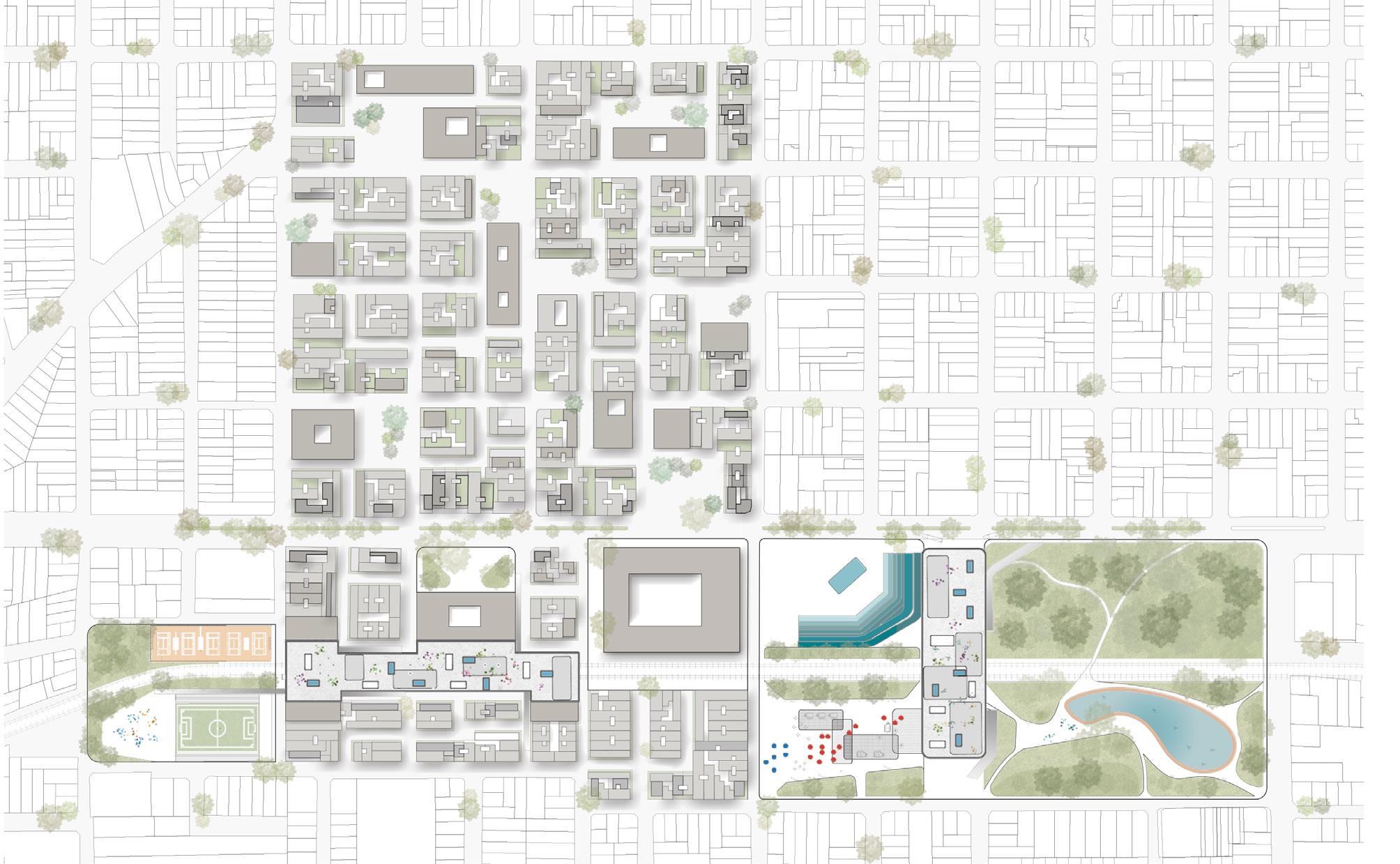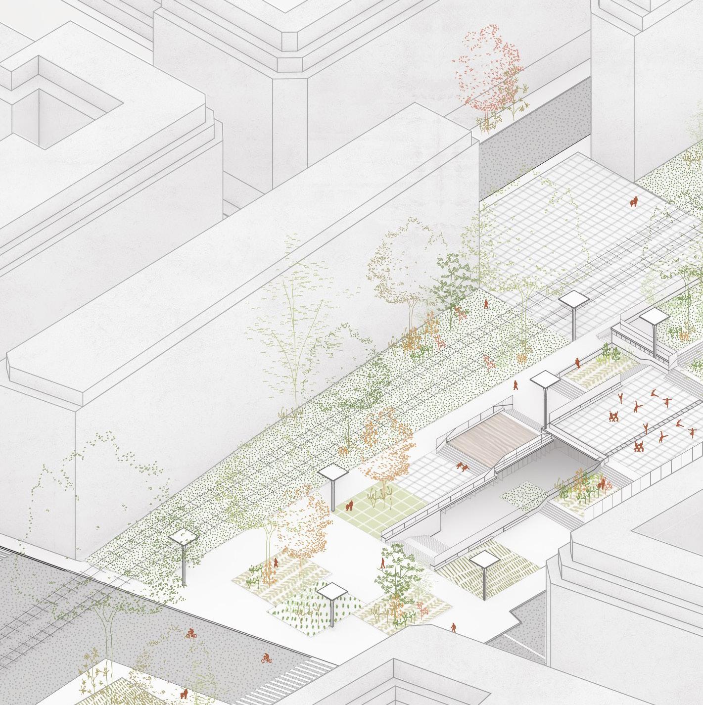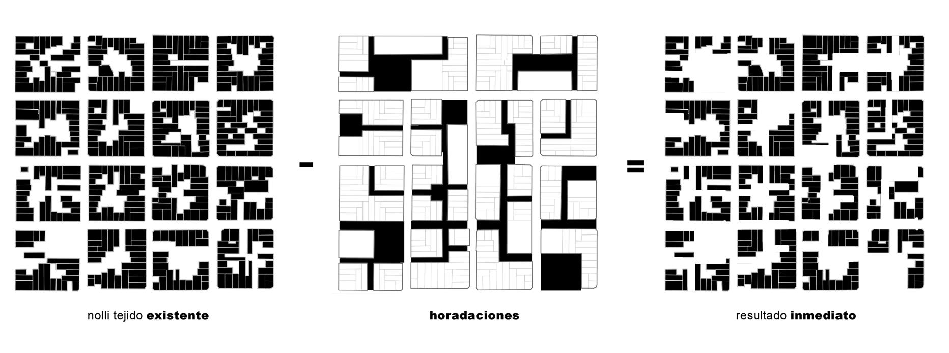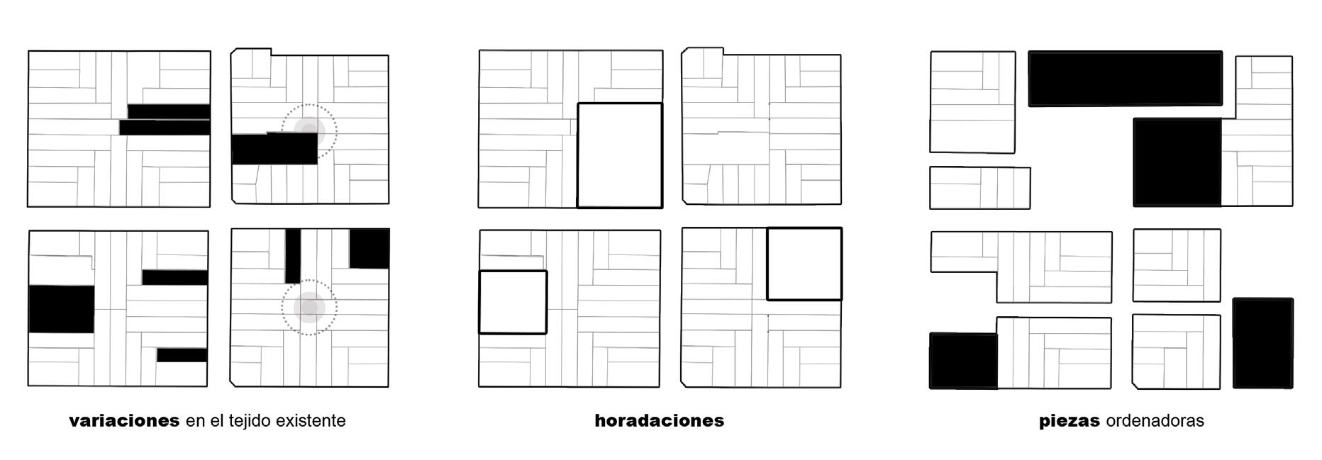 Para ello se adopta una estrategia que consiste en realizar operaciones quirúrgicas sobre el tejido existente con el objetivo de densificar la pisada edilicia mientras se añaden distintas escalas de circulación permiten crear multiplicidad de escenarios a nivel urbano.