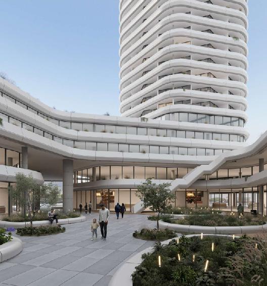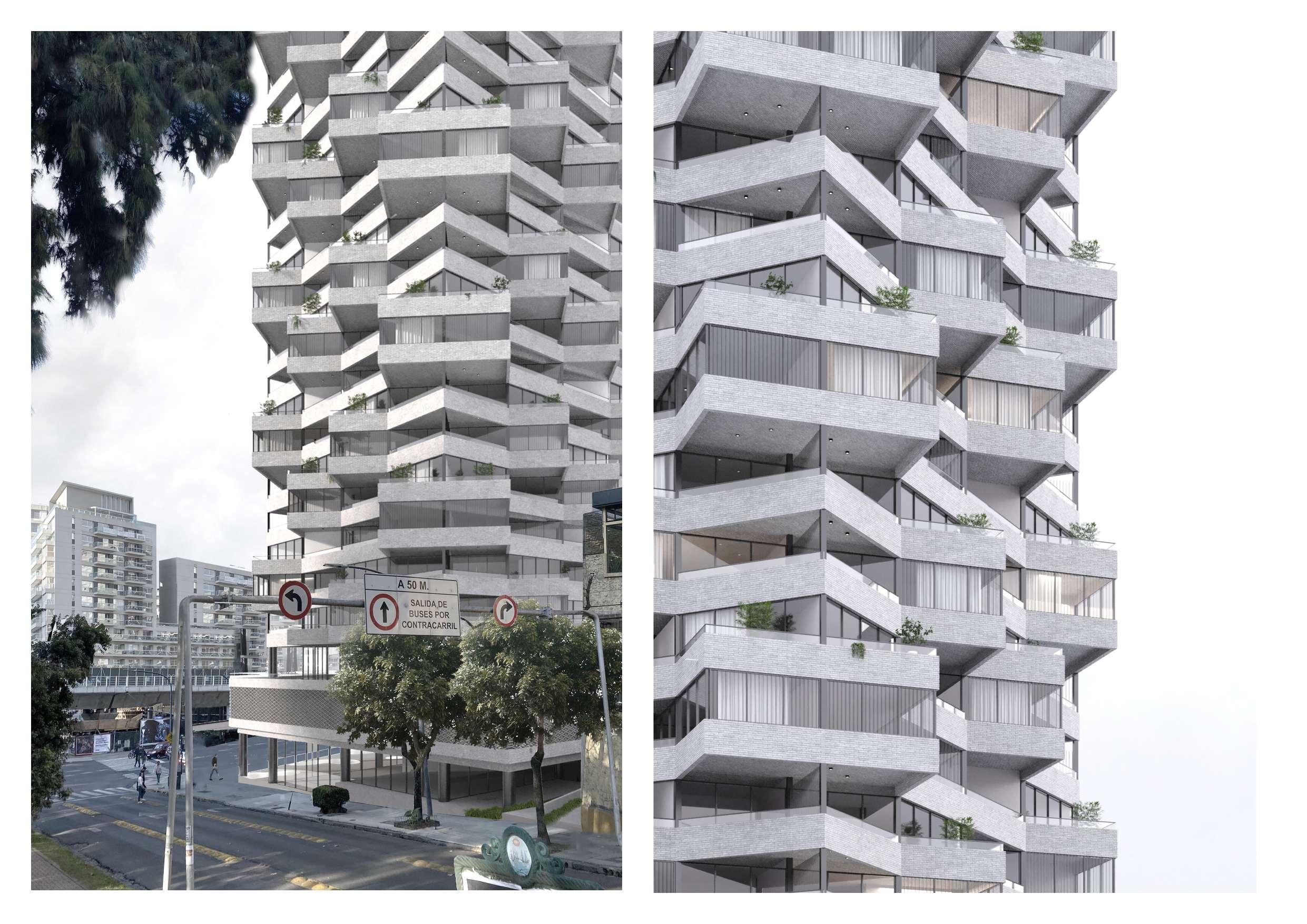 Para ello se proyectaron los usos más públicos en un gran basamento horadado para dar lugar a dos grandes pulmones, que alberga los accesos, comercios y oficinas, y que luego se retrae progresivamente permitiendo el ingreso de luz y a su vez dando lugar a diversas expansiones. Sobre este basamento se sitúan cuatro torres elevadas estratégicamente para mayor aprovechamiento de las visuales y la captación de luz solar, que contienen los programas privados de vivienda y hotel.