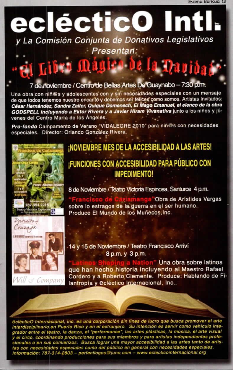 Con la generosa autorización de su editor, el colega y amigo actor, mimo y fotógrafo Javier del Valle, comenzamos a publicación de todo los números disponibles de ESCENA BORICUA, la más importante revista teatral contemporánea (2009-2017), y cuya preservación se hace necesaria para saber el devenir de nuestro teatro Nacional en la última década. Aconsejamos se descarguen y se difundan, pues ella conserva la historia de un momento significativo de nuestra cultura Patria.