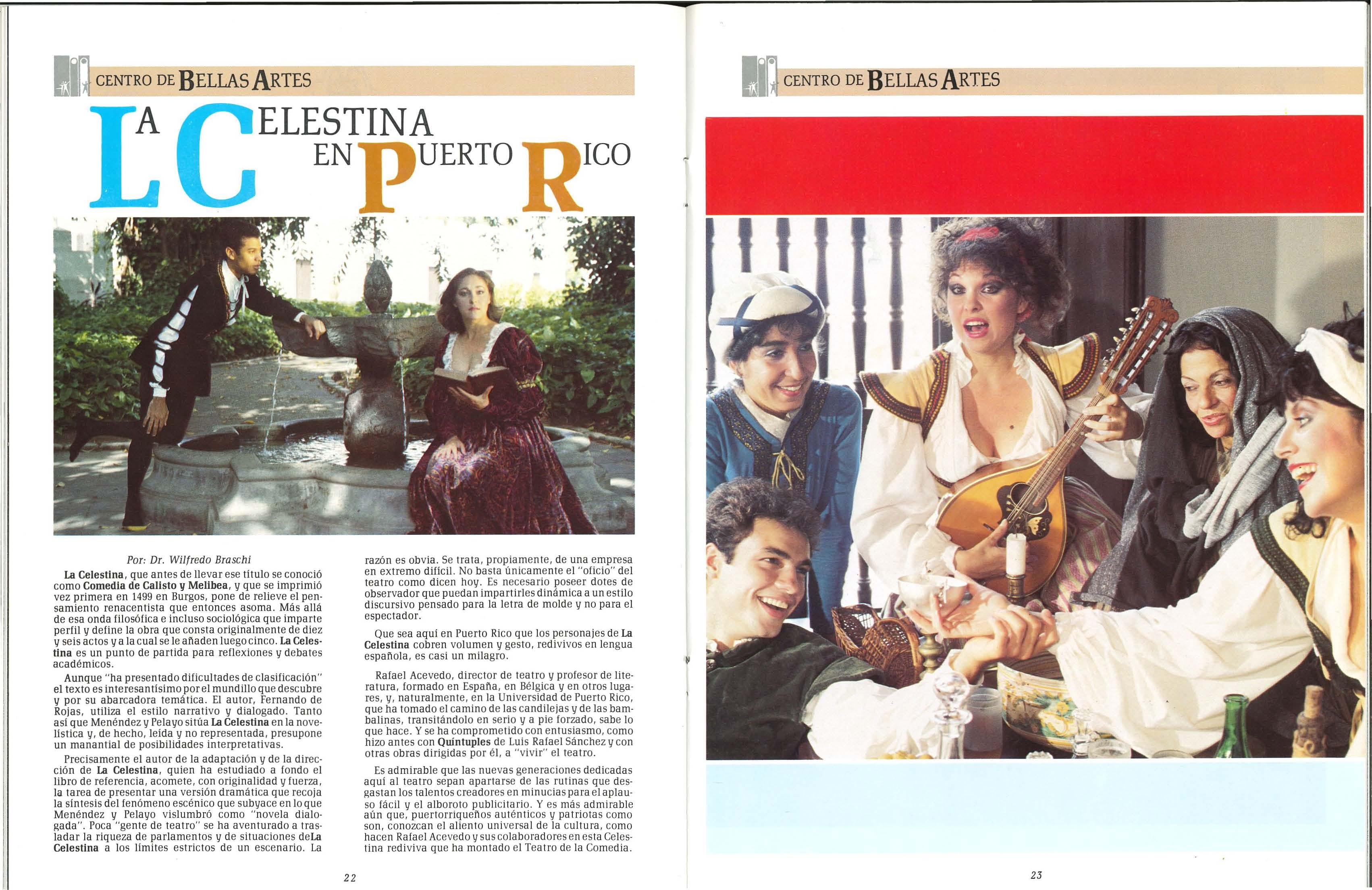 EI Descubrimiento como Interrogante 3 VII Bienal de San juan del Grabado Latinoamericano y del Caribe 8 EI Aplauso 12 Mensaje al Pueblo de Puerto Rico ......... ... . . . . ... . .......... . . .... 17 Zarzuela Luisa Fernanda en Bellas Artes 19 LosCarteles 20 La Celestina en Puerto Rico 22 Areyto·Ballet Folkl6rico Nacional de Puerto Rico . ... . . ................ 24 Cartelera de Actividades noviembre 30 Avance de Cartelera diciembre ...... ................. ................ 3.7 Cuarta Medalla Winston de la Cultura 41 Actualidades: Productora Nacional de Teatro, In c 42 La Ca merata Bariloche 46 NUESTRA