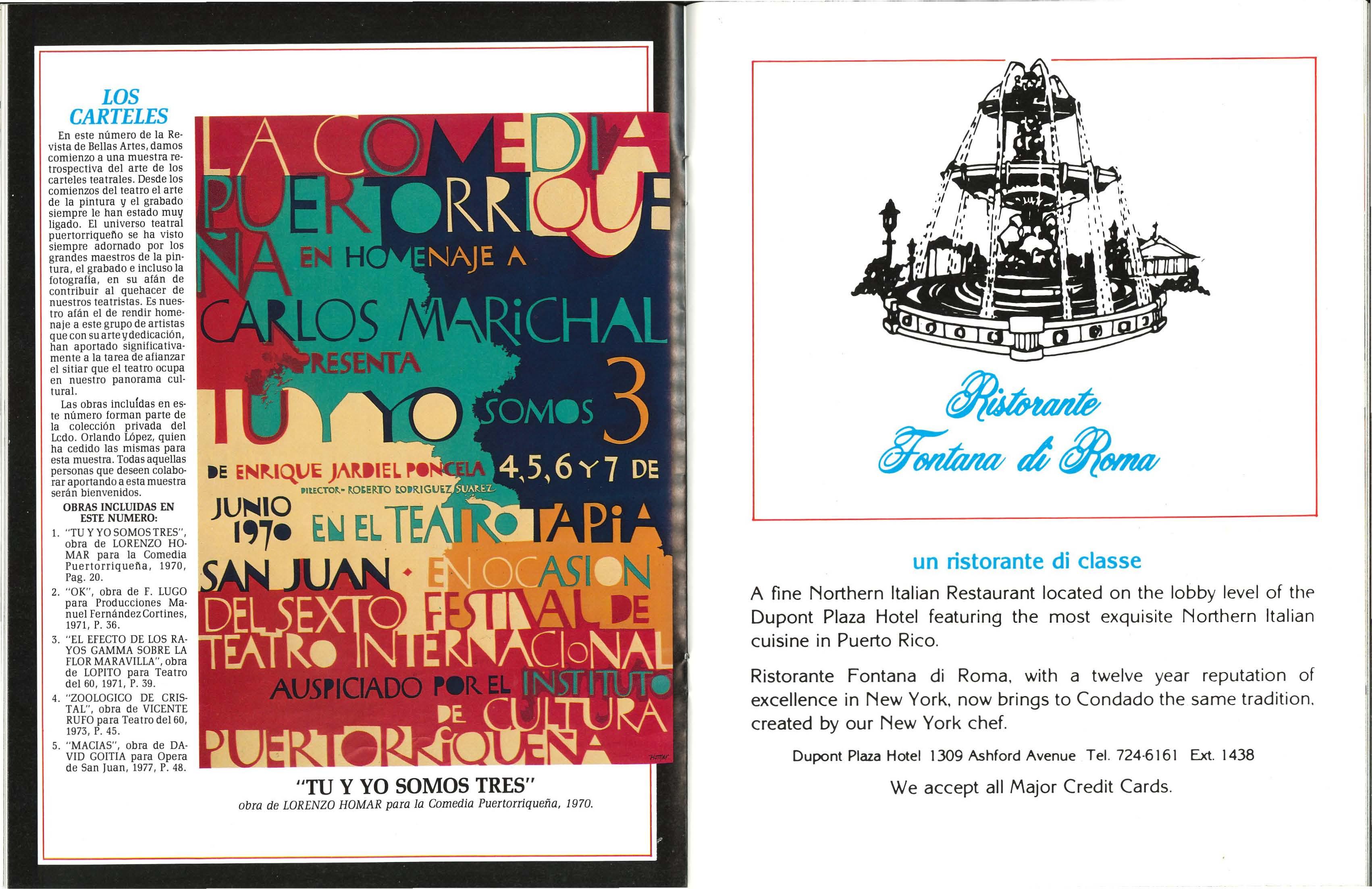 Y linalmente Luis Agrait y su junta de Directores del Instituto de Cultura que Ie die ron la solidez econ6mica con un subsidio de S80,000. para ser dividido entre 7 compaf\ias. A todo esto se une el Centro de Bellas Artes a traves de su directora Carmen Junco que ademas de darnos lacilidades de ensayo y promoci6n, se une al esluerzo colectivo de la temporada al ceder a Prod. Nacionallos S80,000. del Proyecto Alegria que el I.C.P. habia destin ado a Bellas Artes para la grabaci6n de obras de teatro. La hace asi costeando su proyecto POl' su cuenta. Todo esto se hace con un solo empel\o , darle al publico un espectaculo de primera a un costa de boleto accesible.