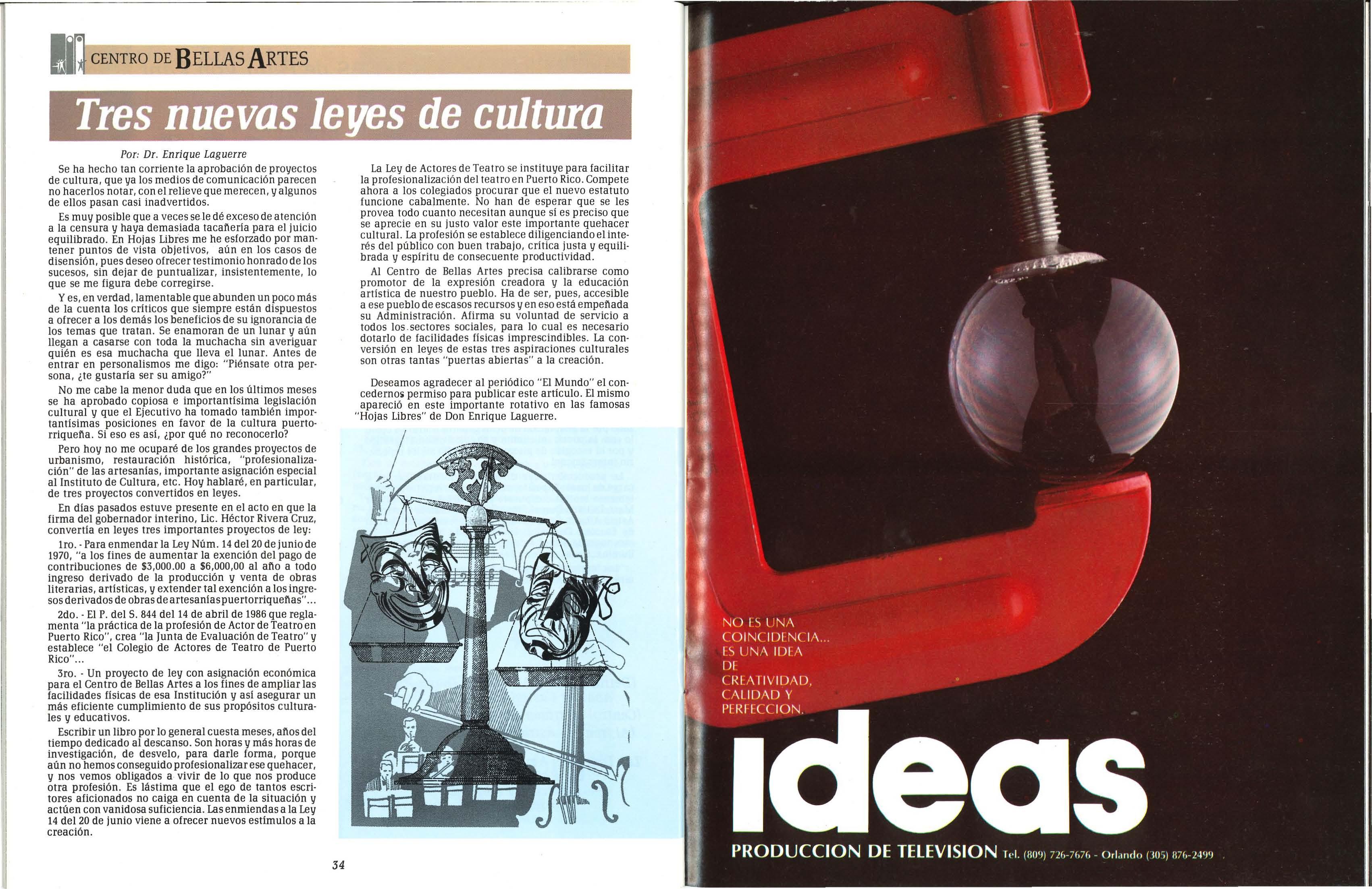 En dias pasados estuve presente en el acto en que la firma del gobernador interino, Lic. Hector Rivera Cruz, convertia en leyes tres importantes proyectos de ley: lro.· Para enmendar la Ley Num. 14 del 20 de junio de 1970, " a los fines de aumentar la exencion del pago de contribuciones de 53,000.00 a 56,000,00 al allo a todo ingreso derivado de la produccion y venta de obras literarias, artisticas, y extender tal exencion a los ingre· sos derivados de obras de artesaniaspuertorriquellas"