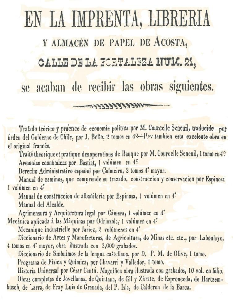81 En agosto de 1857, compró la imprenta y librería de don Francisco Márquez, fundada a mediados de 1837, en la calle de la Fortaleza número 23, y la primera gran librería establecida en San Juan y muy probablemente en toda la Isla. «Avisos», Gaceta del Gobierno de Puerto-Rico [sic], 18 de agosto de 1857, pág. 4; Lidio Cruz Monclova, El libro en la cultura puertorriqueña (San Juan, Puerto Rico: Fundación Puertorriqueña de las Humanidades, 1980), pág. 18; Jaime Alberto Solivan de Acosta, Escritos de don José Julián de Acosta y Calbo, tomo III (Carolina, Puerto Rico: First Book Publishing of Puerto Rico, 1999), págs. 23-24.