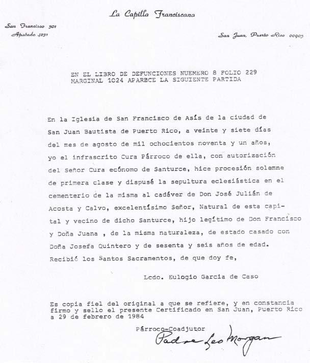 1. Don Manuel Joaquín de Acosta y Calbo, quien nació en San Juan el 19 de agosto de 1815 y fue bautizado en la Catedral de San Juan el 2 de septiembre de 1815 71, 72 .