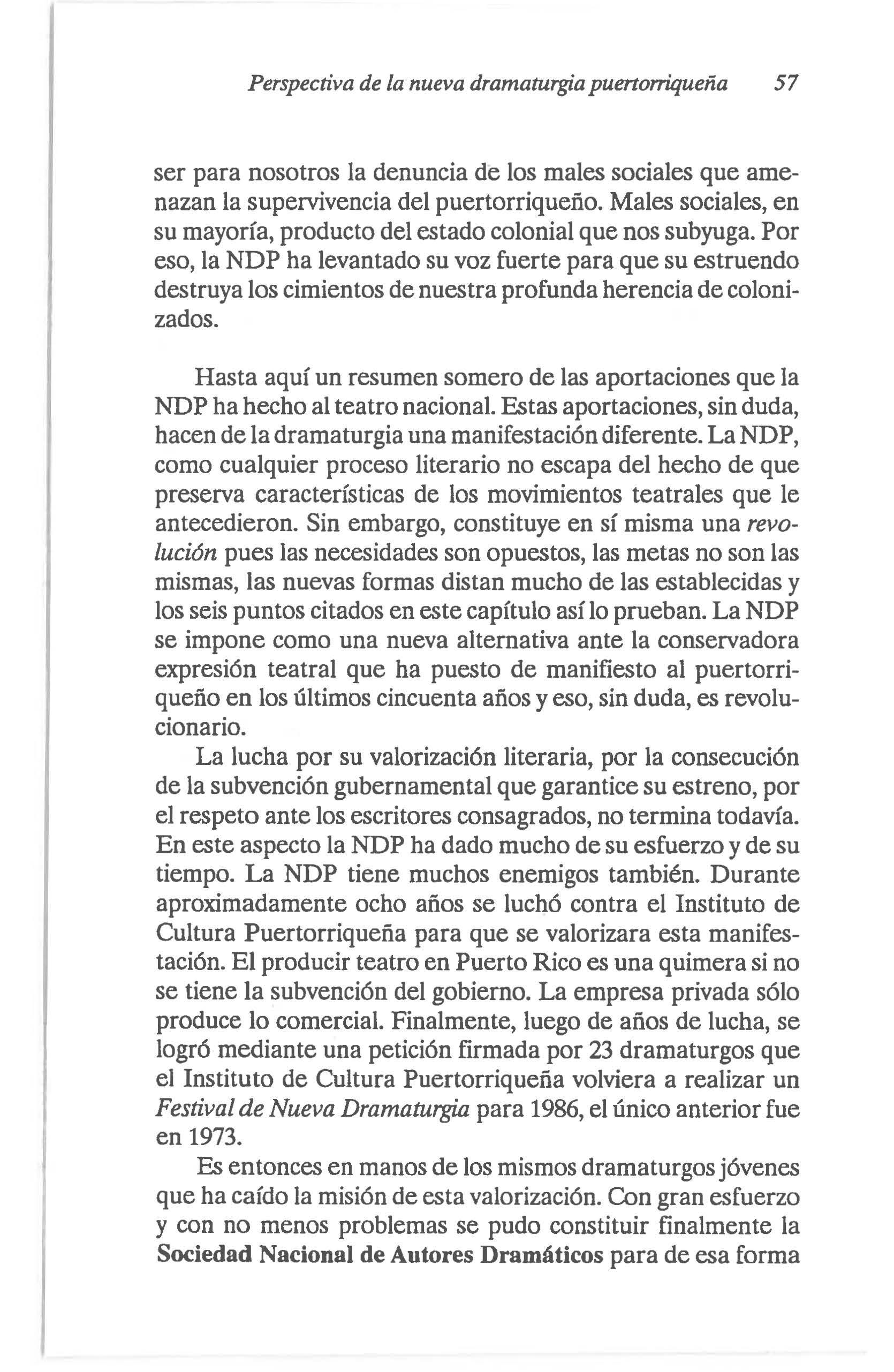 Además, propone establecer a la nueva dramaturgia como un reflejo y respuesta directa a la actual realidad social de Puerto Rico.