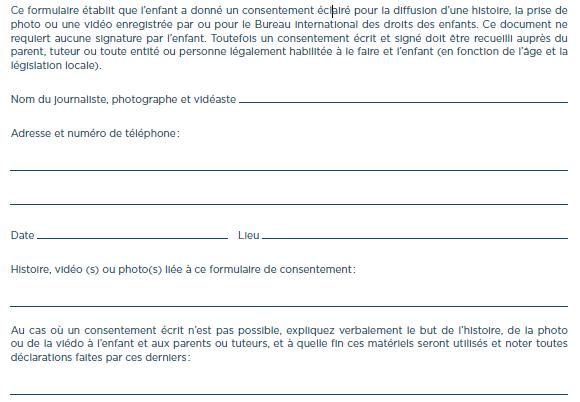 • L’utilisationdephotographiesetd’imagesd’enfantsdanslespublicationsestsubordonnéeàun consentement éclairé et écrit de l’enfant et de ses parents ou personnes ayant la charge de l’enfant.Unconsentementéclairésous-entendquel’individucomprendlescirconstancesdans lesquelles l’image sera utilisée et toutes les conséquences possibles de sa publication, distribution,oucirculation.