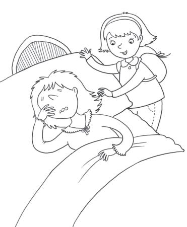 Questa mattina ricomincia la scuola. Paola si sveglia per prima. Si alza e va a scuotere la mamma che dorme ancora.