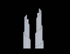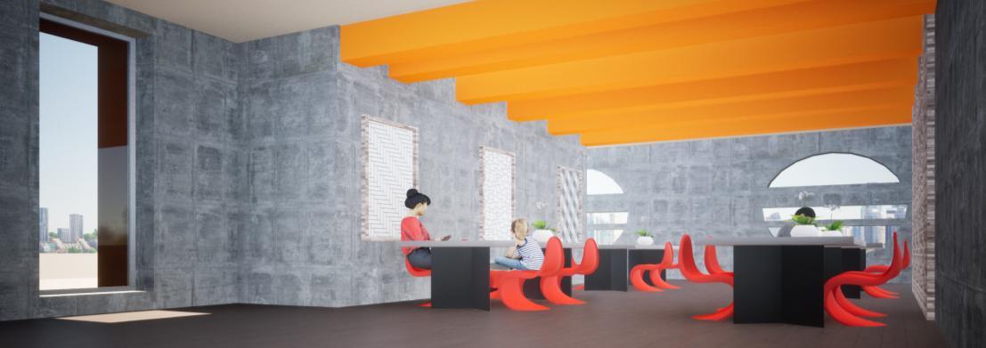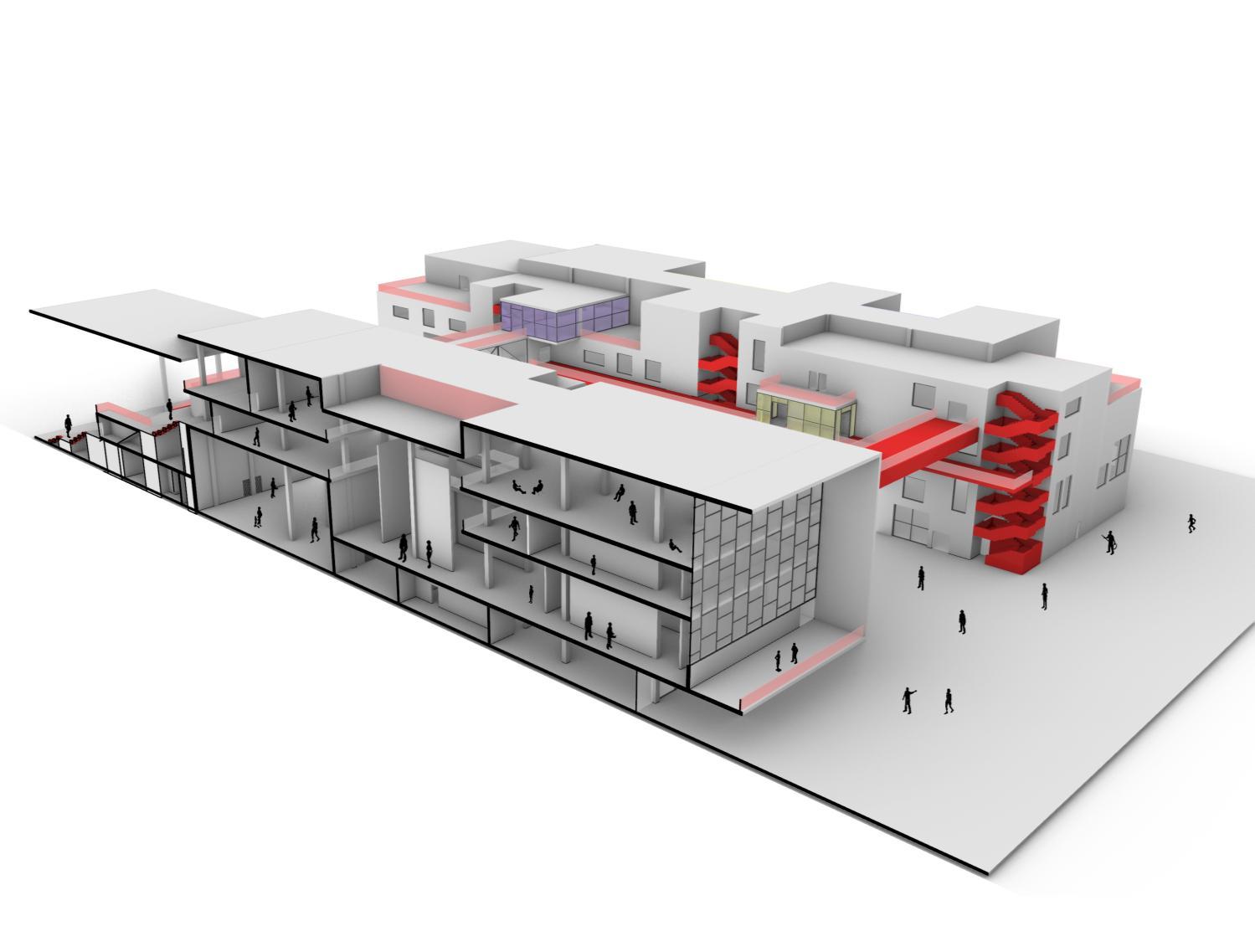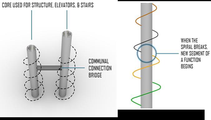 The word pulverized comes from the idea of having something reduced to fine pieces, as the building is made up of 7 elements from the ‘La Ville’ painting by Fernand Leger. The 7 numbered elements have been taken and rotated in a way that there can be a solid core for the building to install emergency exit stairs, load bearing walls, and elevator shafts.