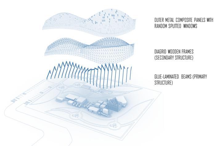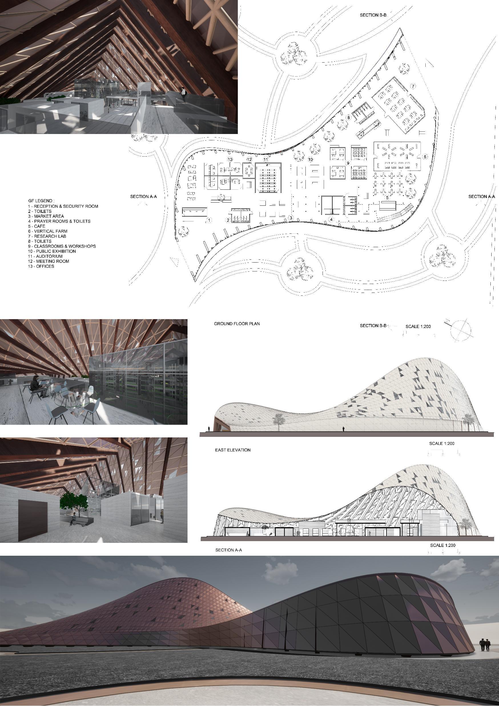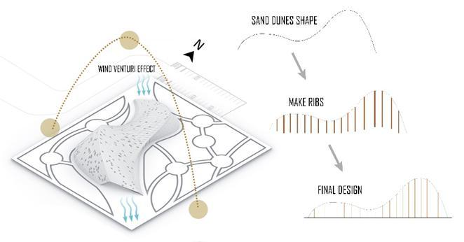 The term ‘Remal’ means sands in Arabic as the main concept of the structure is inspired by the sand dunes, since it is located in a deserted barren land surrounded by an oasis. The building’s curves are connected by 2 sand dunes shapes at different heights to form a continuous structure.