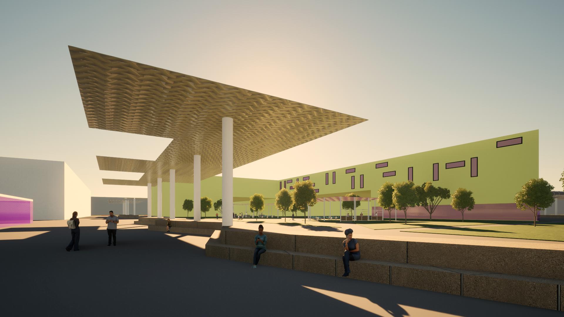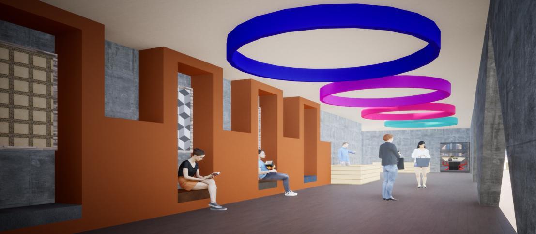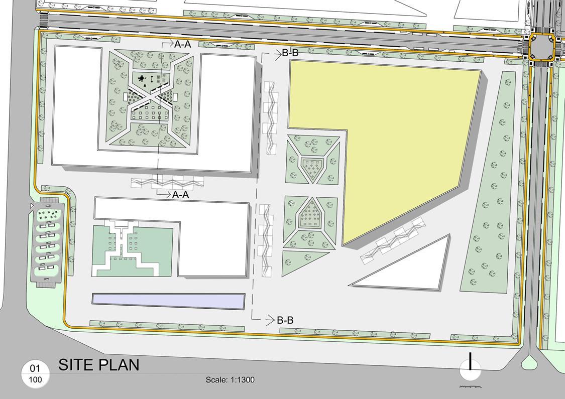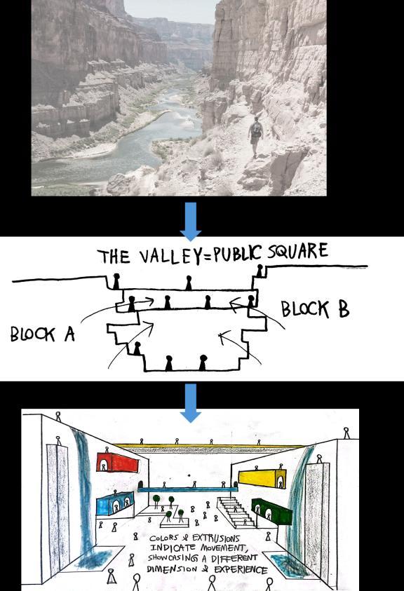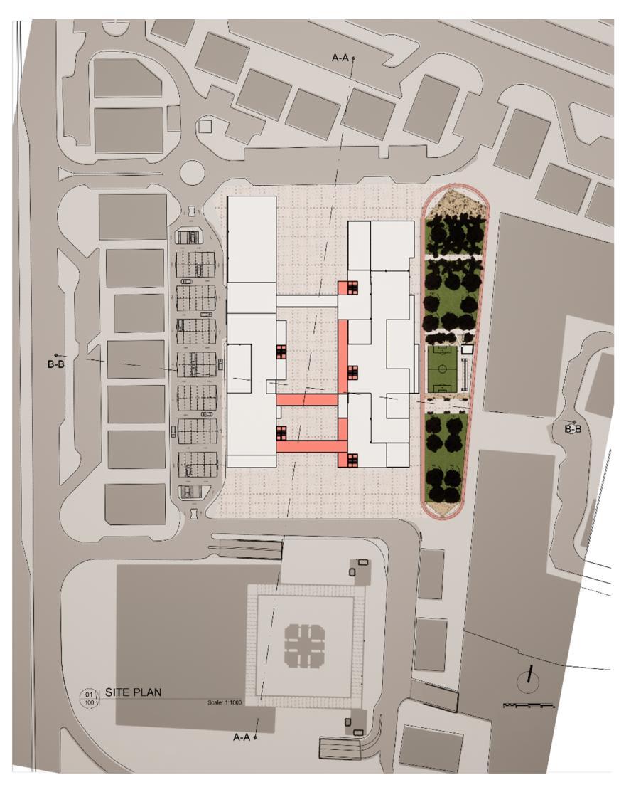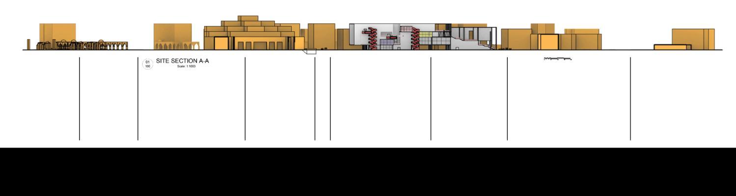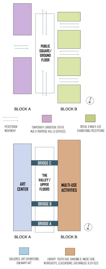The Art Center suggests a pedestrian passage-way that would serve as a public square, which would connect the existing Sheikha Salama Mosque’s courtyard and the upcoming Al-Ain Train Station (According to Al-Ain 2030 Plan by the Municipality). This passage-way would be known as ‘The Valley’. Therefore, it would be the central area for a prospective destination in Al-Ain’s central district.