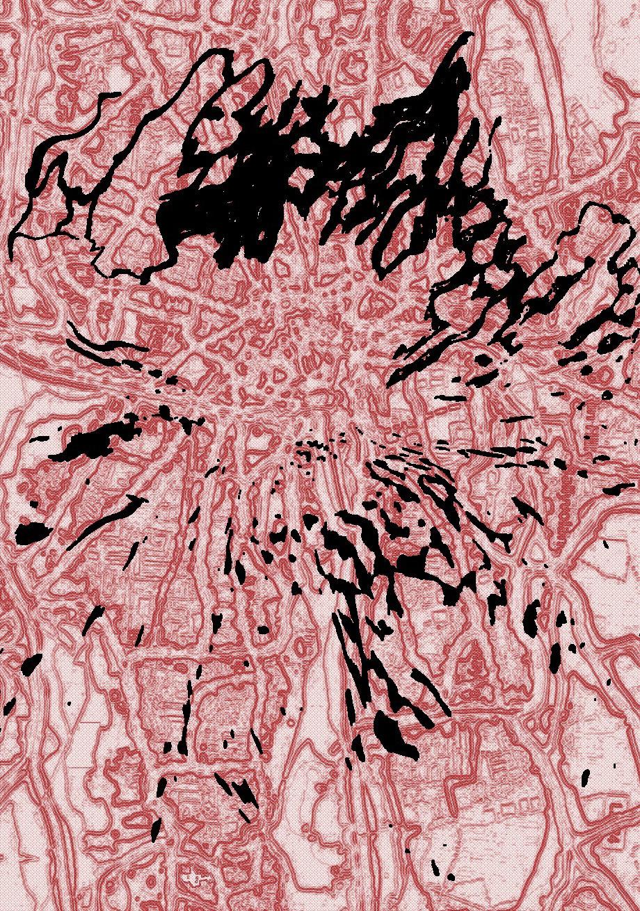 After every show you listen for the river stared down and saw your beetle city; centre: liquid, crunchy shell, beaten, peeled, and clattered fast left to sit like scum on quays; re!ections of tenements with chitin strained from growth spurts,