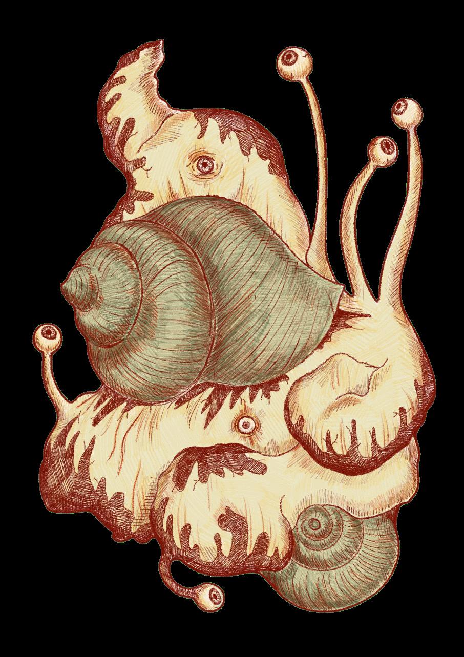 Embody the snail while you appreciate the art encased within this magazine. Let the pages shelter you from the rain, like a friendly leaf with a surprisingly advanced vocabulary. Savour each piece. Come back to them every now and then when you find yourself moving too fast. We will still be here, waiting patiently, smiles on our gastropod faces.