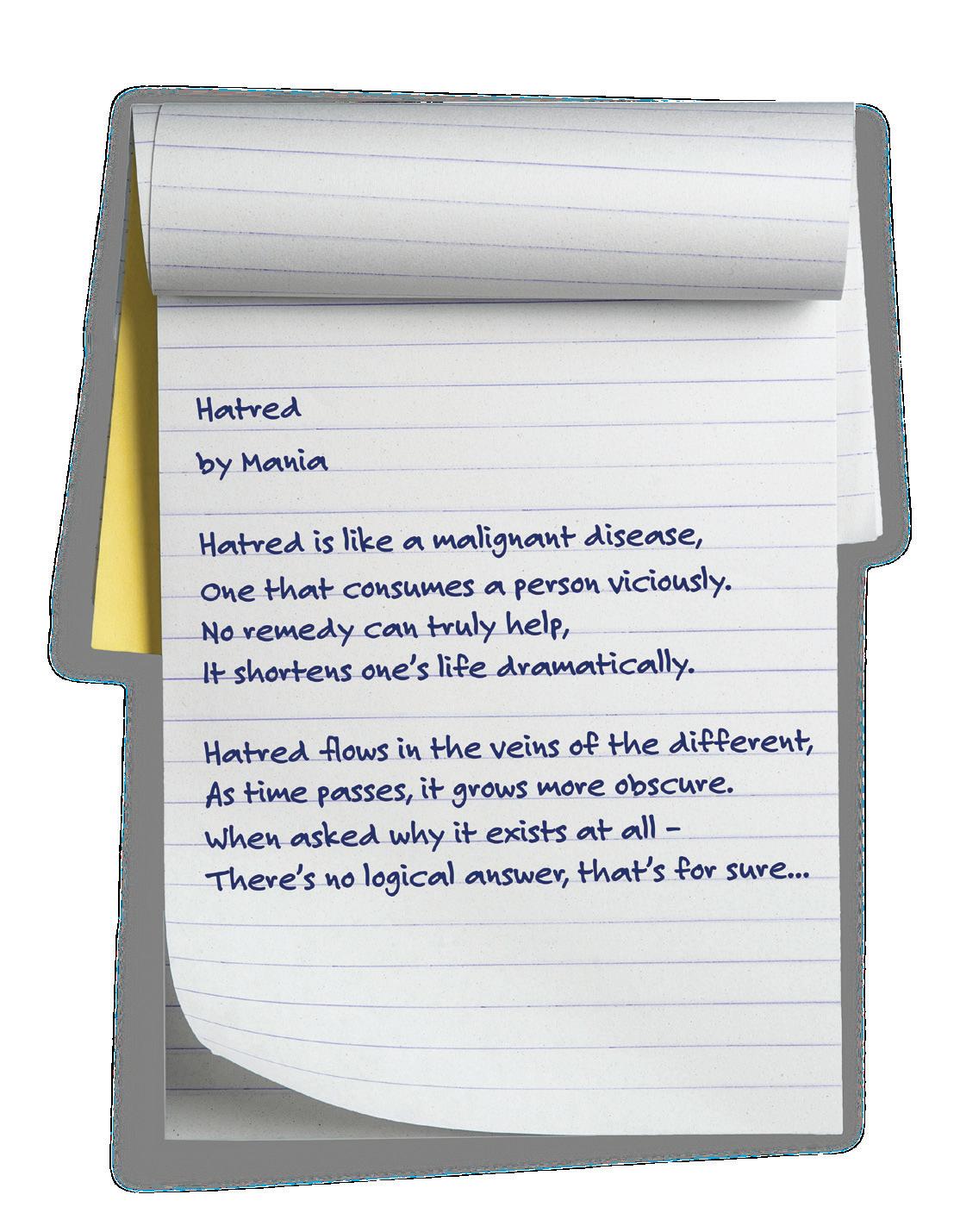 Mania, one of our long-term residents, is an artist and writer who loves to capture moments from daily life in poetry and paintings. During the recent war, she wrote several powerful poems about hatred as a cry from the heart