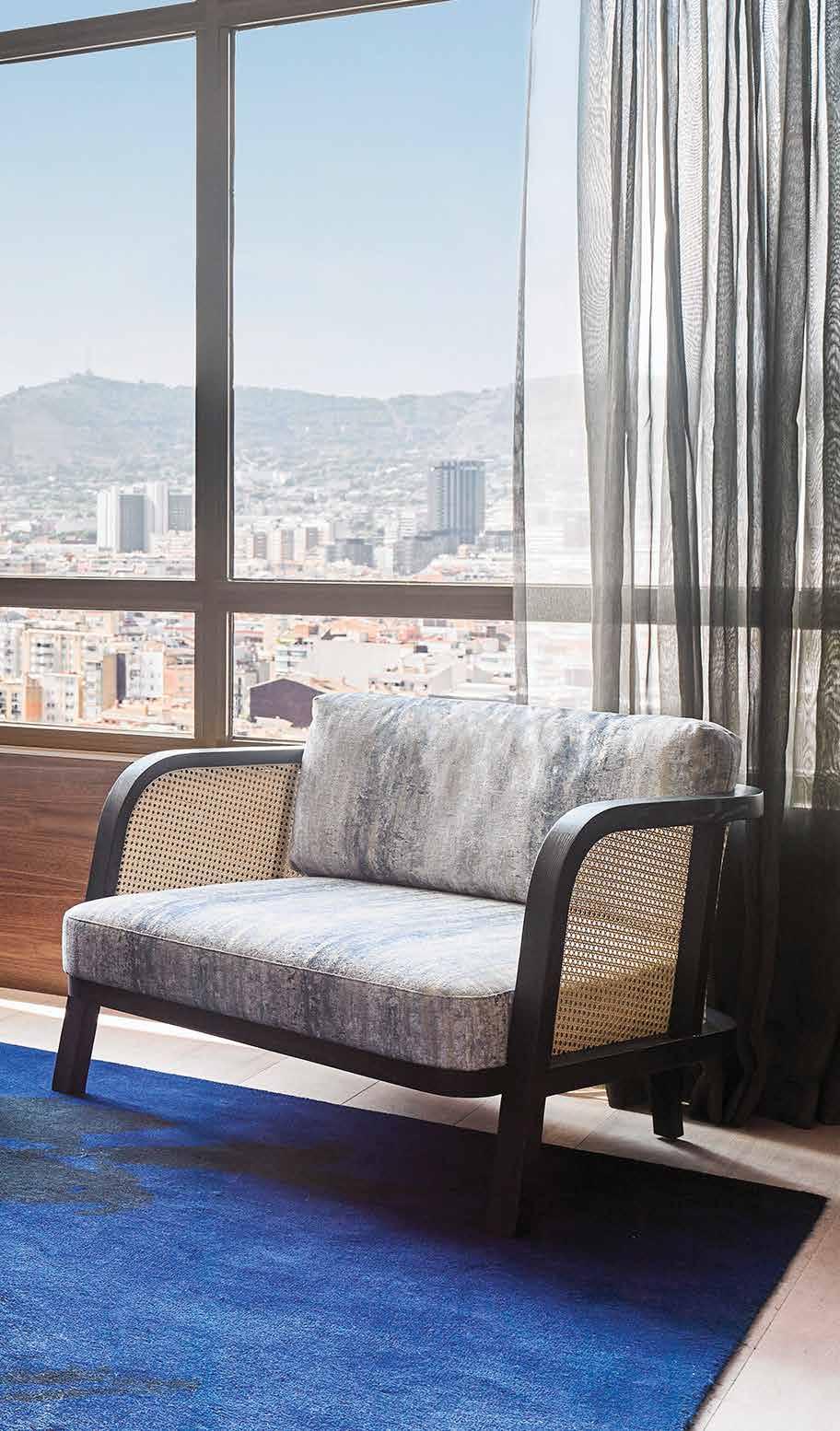 fabric, the sofa adds a sense of intimacy to the room’s two-story volume, which is overlooked by the mezzanine lounge. A two-inch pile silk rug in a shade of plum underscores the room’s seating area. “The rug has a lot of ‘crush’ to it, so you see variations in the color,” Maynard points out.