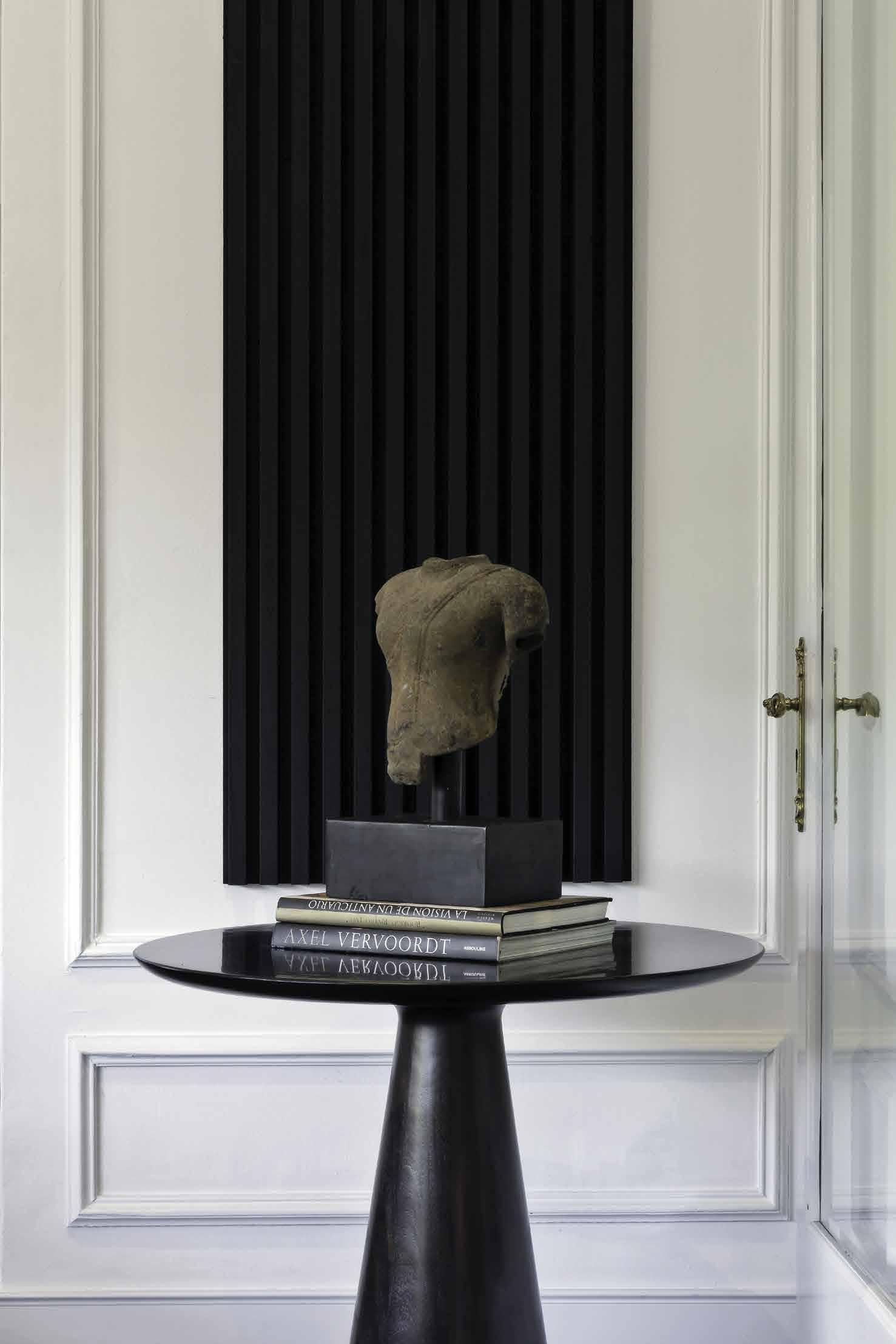 Maynard also lent his touch to other rooms. In the office, a Vladimir Kagan desk holds court against walls clad in mahogany inset with polished stainless steel bands. In the sewing room, a custom cabinetry system stylishly stores supplies for the wife’s crafts. And in the entry, he took a sculpture by Dylan Lewis, a South African artist, that the owners found during a trip and used it as a base for a glass-topped table.