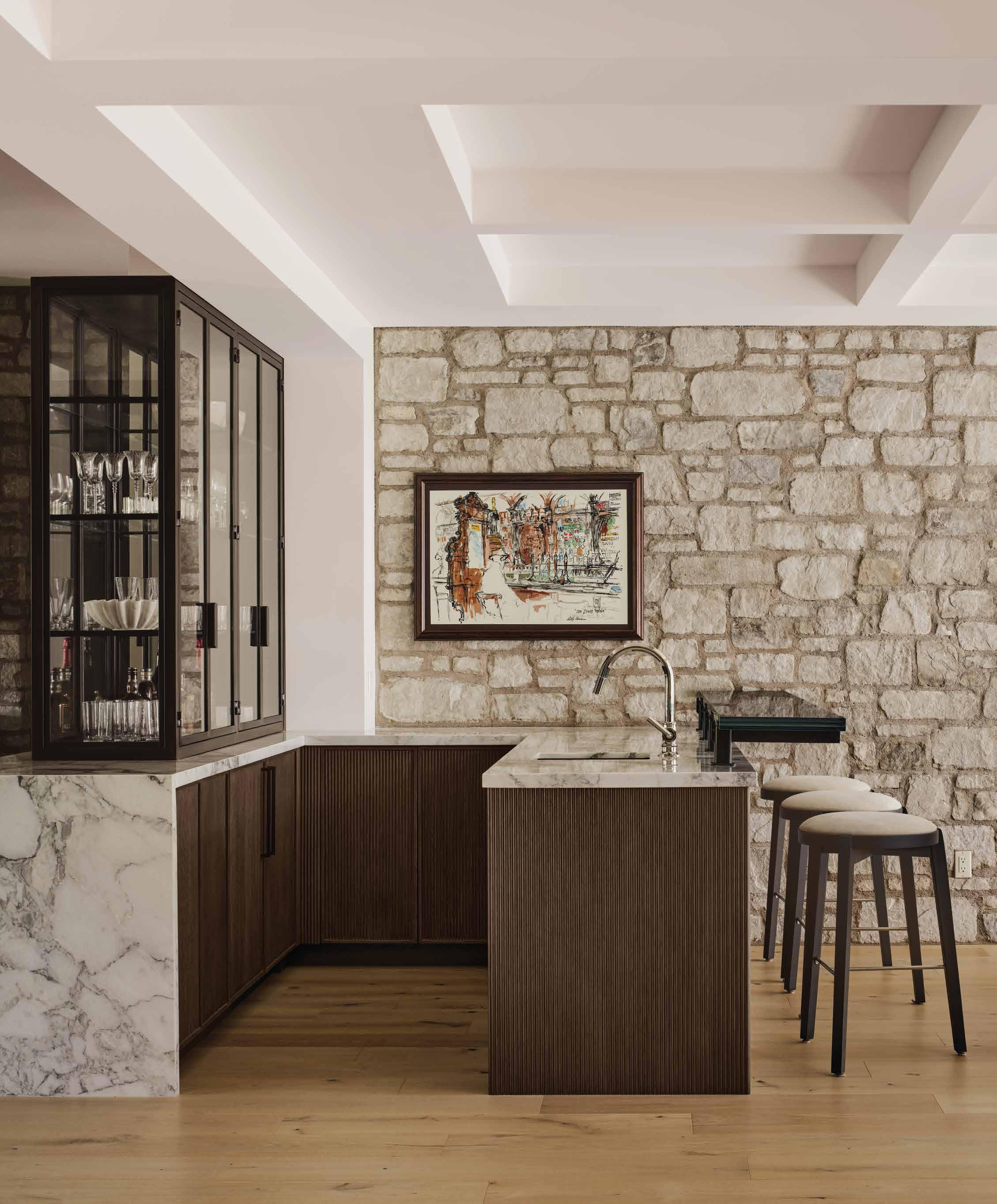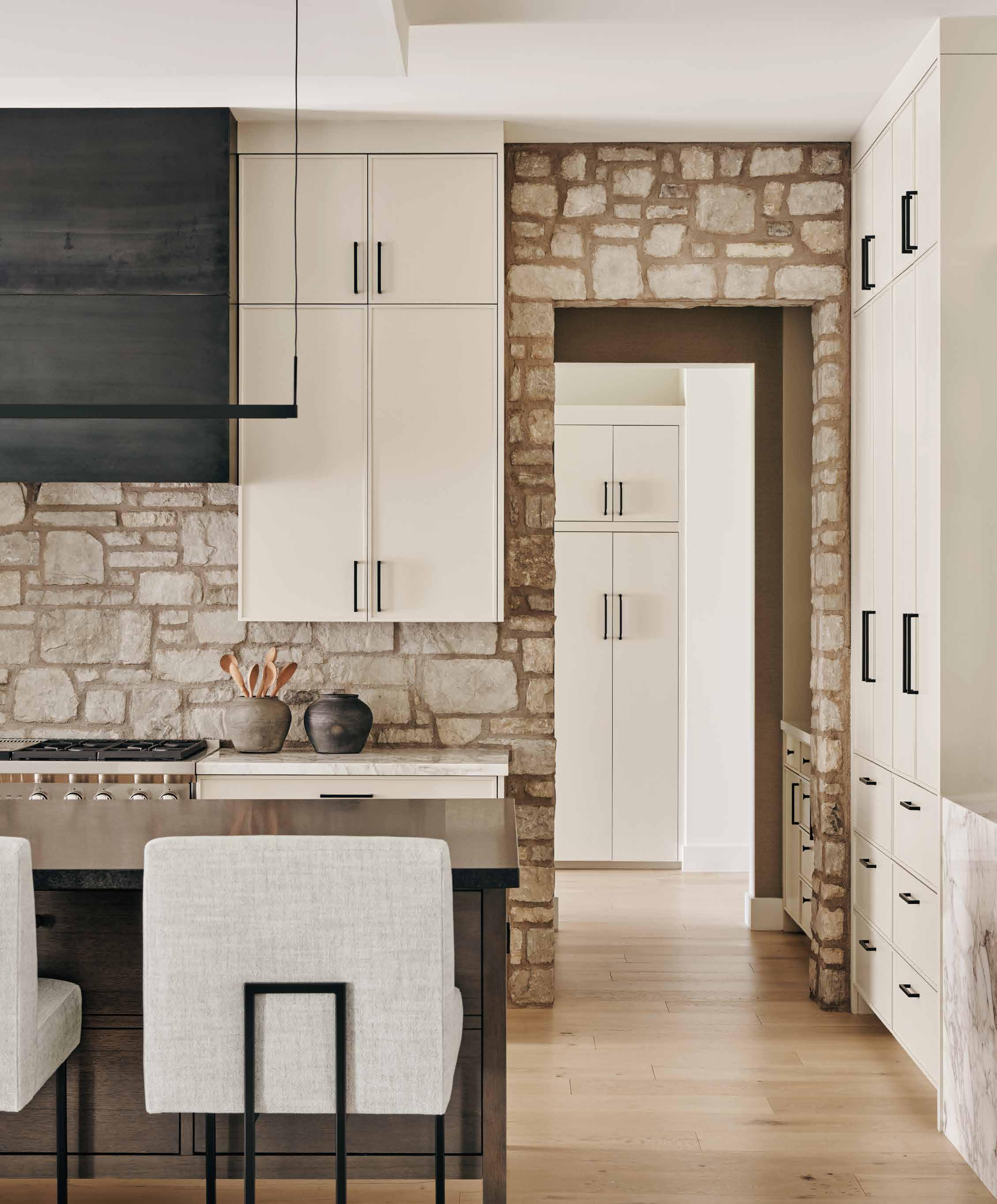The obstacle, says Maynard, was creating that look in the house without ripping out the entire interior and starting over. The designer mulled the possibility. “The challenge was to do ‘moody’ in a voluminous house with big windows,” he explains. Working with the home’s original architect, Chris Light, and builder, Russ Schwinn, the interior designer opted to keep much of the home’s original cabinetry and backgrounds, layering in elements to create the new look.
