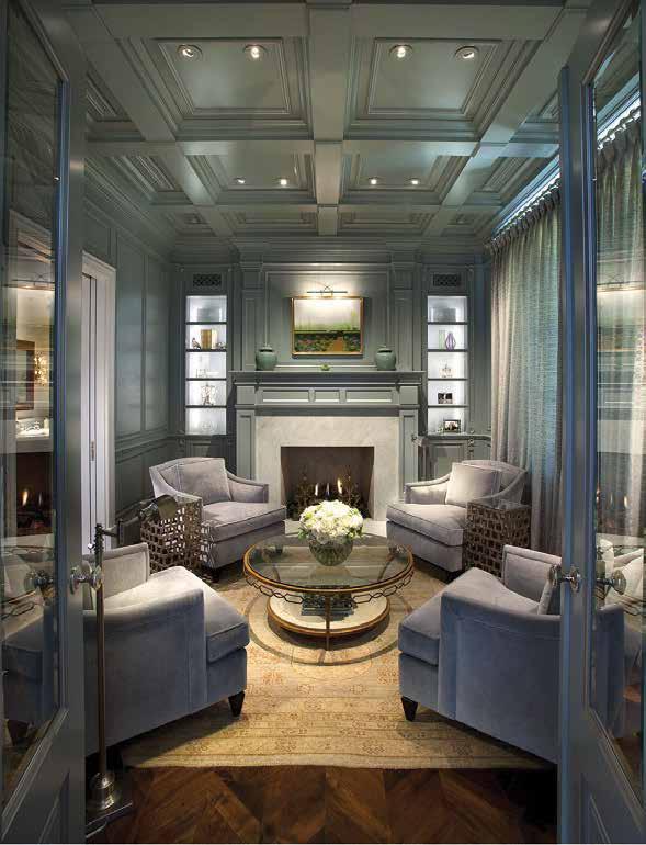 With the backdrops in place, Maynard suggested furnishings, textiles, accessories and lighting that captured the exuberant 1920s and 1930s design era. In the great room, the interior designer channeled Vladimir Kagan in the custom design of a sinuous backto-back sofa, placed to face a piano in one direction and some armchairs on the other side. Done in a deep aquamarine velvet