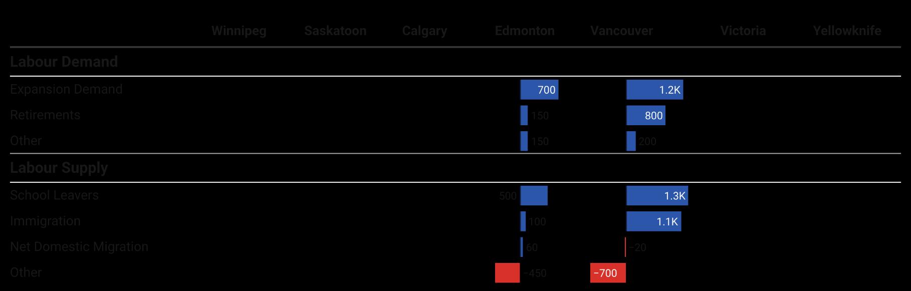 While short run business cycle factors are not significant considerations in the long run projections, there are a few additional caveats that need to be highlighted for the CMA level granular forecasts presented in this report. These include the fact that occupational labour market data at the city level is often suppressed, especially for smaller cities with fewer professionals, and this necessitates making assumptions or relying on older snapshots of the local economy.